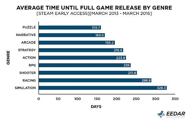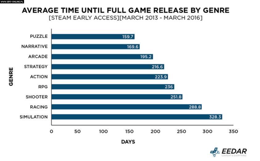 Które gry Early Access wymagają najwięcej pracy? Pierwsze miejsce na tym polu nie powinno nikogo zaskoczyć – chodzi o gry symulacyjne (328,3 dni potrzebnych na ukończenie), do których zaliczono zapewne wszelkie sandboksowe produkcje surwiwalowe, pokroju DayZ czy Rust. Na drugiej pozycji uplasowały się tytuły wyścigowe (288,8 dni). Najszybciej z „wczesnego dostępu” wychodzą gry łamigłówkowe oraz narracyjne, co wydaje się zrozumiałe: przeważnie mają one dość wyraźnie zarysowaną i skondensowaną formę, w porównaniu do chociażby wspomnianych „symulatorów przetrwania”.