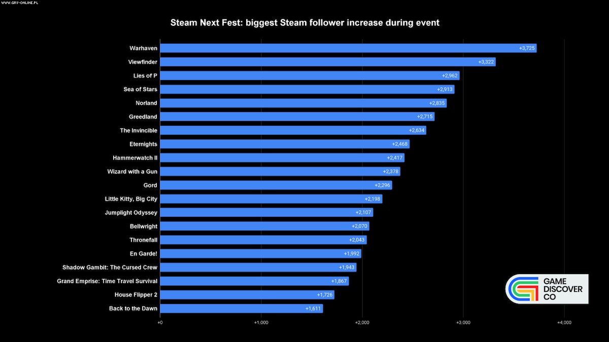 Z danych (wykres poniżej) opublikowanych przez Gamediscover dowiedzieliśmy się, że na tym polu dominuje multiplayerowa gra akcji TPP – Warhaven, która w trakcie Steam Next Fest zebrała 3725 dodatkowych followerów. Na drugim miejscu uplasowała się łamigłówka Viewfinder (3322). Podium zamknęło RPG akcji – Lies of P z wynikiem 2962 obserwujących „na plus”.