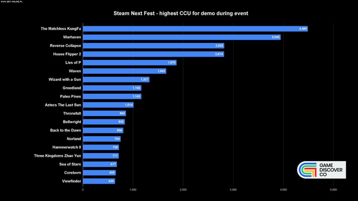 Zastanawiacie się, jakie wersje demo cieszyły się najwyższą liczbą aktywnych graczy w jednym momencie? Na to pytanie również znalazła się odpowiedź. Królem tej kategorii okazało się RPG z otwartym światem – The Matchless KungFu. Demo produkcji HuanMos Game w peaku ogrywało 4489 osób. Druga pozycja ponownie padła łupem Warhaven (3945). Z kolei trzecie miejsce z wynikiem 2820 graczy zajęło taktyczne RPG – Reverse Collapse. Co ciekawe to demo nieznacznie wyprzedziło polski symulator House Flipper 2 (2814).