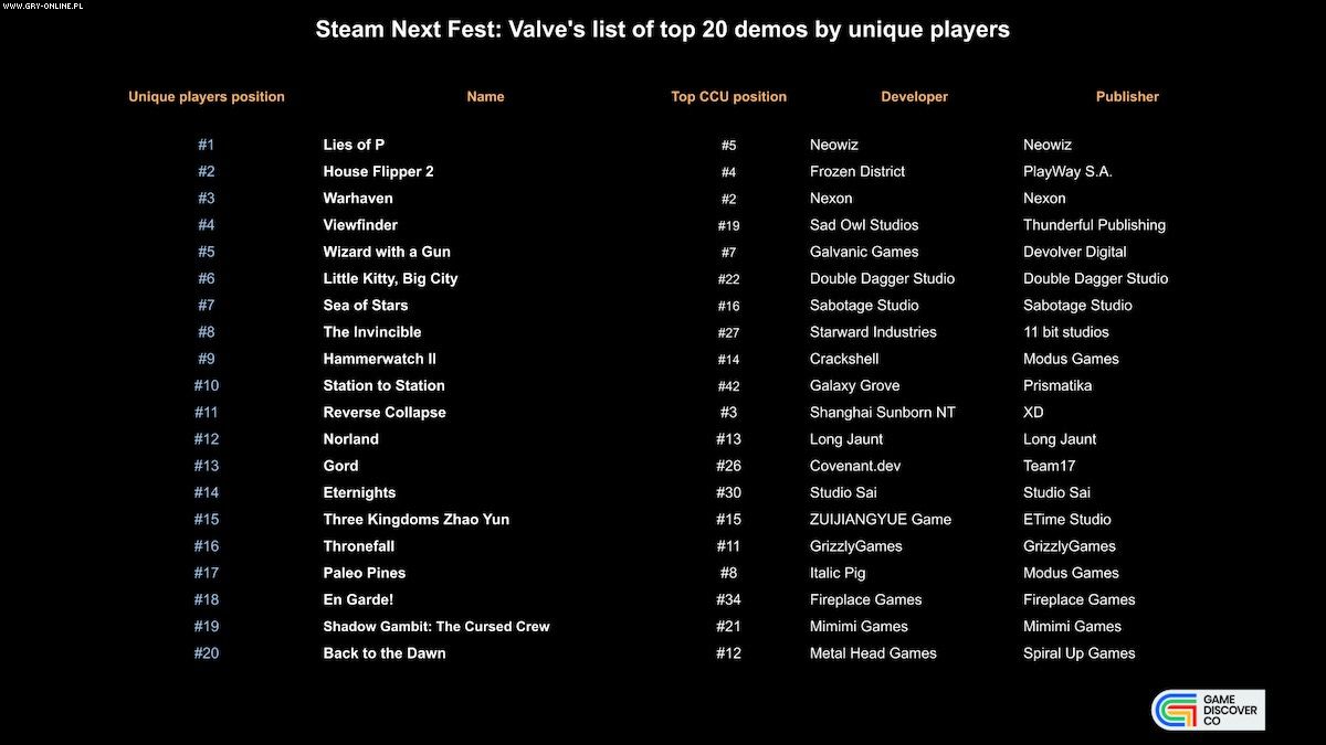 Warto jednak zaznaczyć, że CCU nie zawsze dokładnie odzwierciedla popularność konkretnej produkcji. W związku z tym Valve opublikowało listę 20 najlepszych gier w wersji demonstracyjnej opartej na liczbie unikalnych graczy. I tak: będące na piątym miejscu w rankingu CCU Lies of P „przeskoczyło” na pierwszą pozycję w rankingu unikalnych graczy. Zaraz za nim uplasowało się House Flipper 2 (czwarte miejsce CCU). Pierwszą trójkę zamknęło Warhaven (druga pozycja pod względem najwyższej liczby aktywnych graczy w jednym momencie).