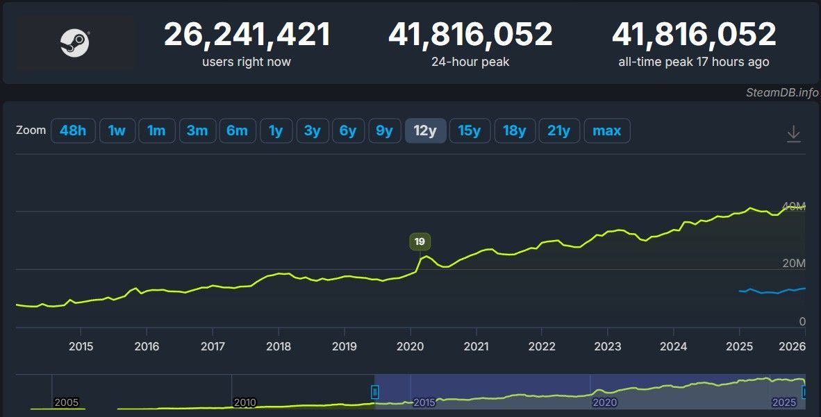 W minionym roku mieliśmy okazję kilkukrotnie zaobserwować, jak na Steamie pada rekord jednocześnie zalogowanych użytkowników. Początek 2026 roku również rozpoczął się dla platformy Valve bardzo dobrze – wczoraj, niespełna 3 miesiące po poprzednim rekordzie, w tym samym momencie korzystało z niej najwięcej graczy w historii.