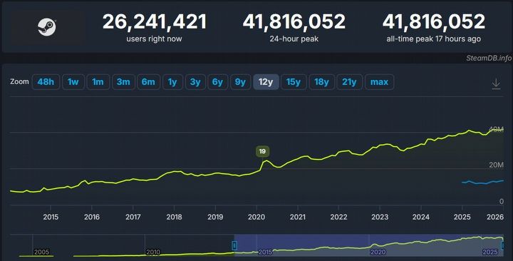 Dziś, tj. 11 stycznia 2026 roku, Steam po raz pierwszy w historii przekroczył barierę 42 milionów jednocześnie zalogowanych użytkowników.