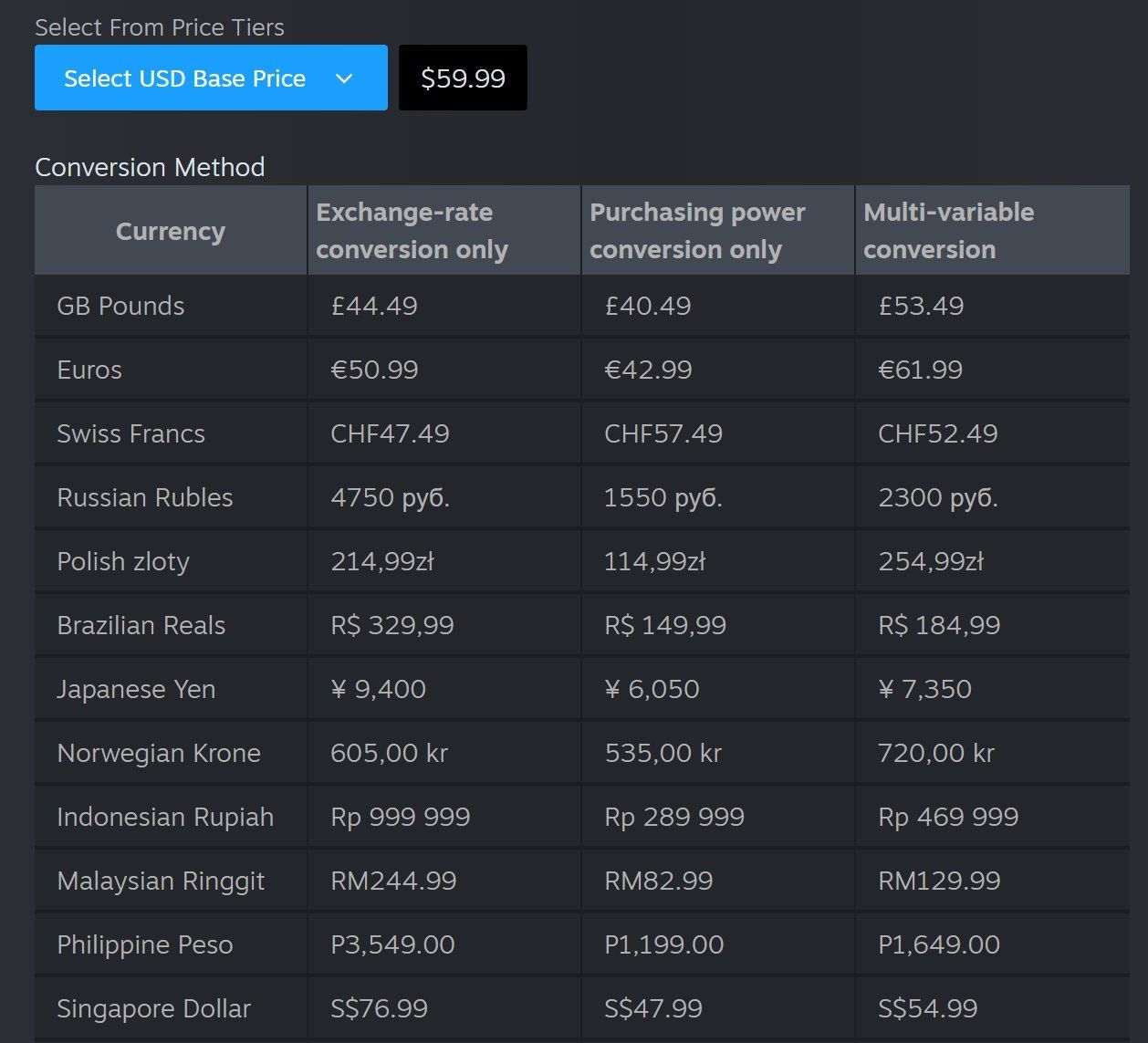 Pierwszym z nich jest konwersja używająca tylko prostego kursu wymiany walut we wskazanym czasie. Drugą opcją jest konwersja oparta wyłącznie na sile nabywczej, która korzysta z danych publicznych dotyczących zamożności klientów w danym kraju. Trzecia, domyślna metoda to konwersja wielozmienna, biorąca pod uwagę wiele czynników, w tym lokalną siłę nabywczą, spodziewany koszt dóbr z segmentu rozrywki oraz aktualny kurs wymiany walut. Ta ostatnia metoda jest najbardziej zbliżona do mechanizmu używanego przez platformę w przeszłości.