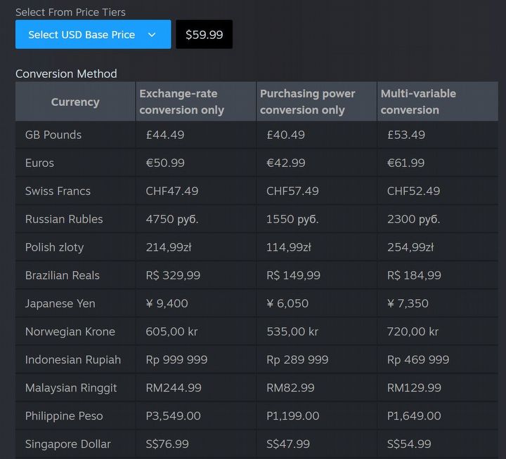 Jeśli twórca zdecyduje się teraz na konwersję po sile nabywczej, nowa cena dla Polski wyniesie zaledwie 28,25 zł. Wybór prostej konwersji według kursu walut ustali kwotę na poziomie 53,99 zł. Jeśli deweloper pozostanie przy domyślnej konwersji wielozmiennej, cena nieznacznie spadnie do 62,99 zł.