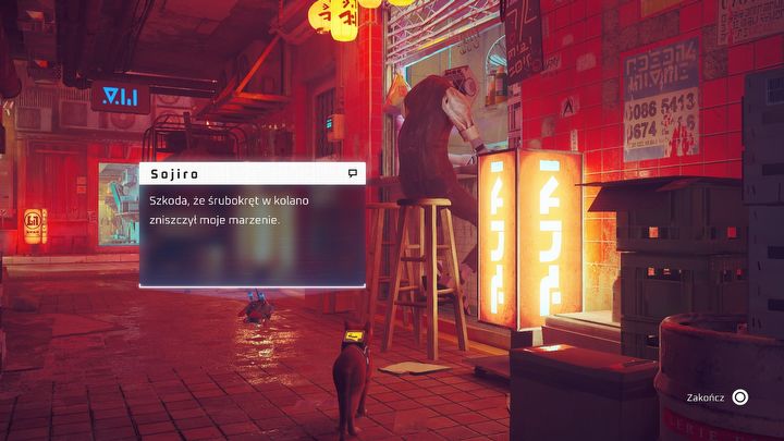 Drugie „wielkanocne jajo” odnosi się do znacznie bardziej kultowego cytatu ze Skyrima. Mowa o zdaniu: „Kiedyś byłem podróżnikiem jak ty, potem dostałem strzałą w kolano”. W Stray nawiązuje do niego robot Sojiro, którego można znaleźć siedzącego przy oknie w jednym z lokali w Śródmieście.