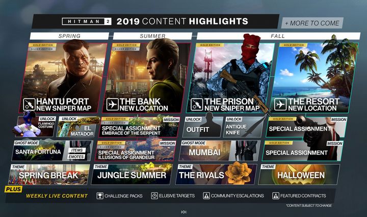 Studio IO Interactive przedstawiło plany rozwoju gry Hitman 2, czyli najnowszej części przygód płatnego mordercy znanego jako Agent 47. Obejmują one zawartość, która będzie udostępniana co tydzień (tzw. Weekly Live Content), a także większe aktualizacje, mające pojawiać się w kolejnych miesiącach.