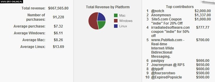Przypominamy, że pierwsza edycja Humble Indie Bundle przyniosła przychód w wysokości 1,273,588 dolarów. Akcję wsparło 138,811 donatorów (płacąc średnio 9,17 dolarów). Na rzecz organizacji Penny Arcade's Child's Play oraz Electronic Frontier Foundation przekazano wówczas odpowiednio 188,578 dolarów i 183,601 dolarów. Reszta wpadła do kieszeni twórców gier wchodzących w skład kompilacji.
