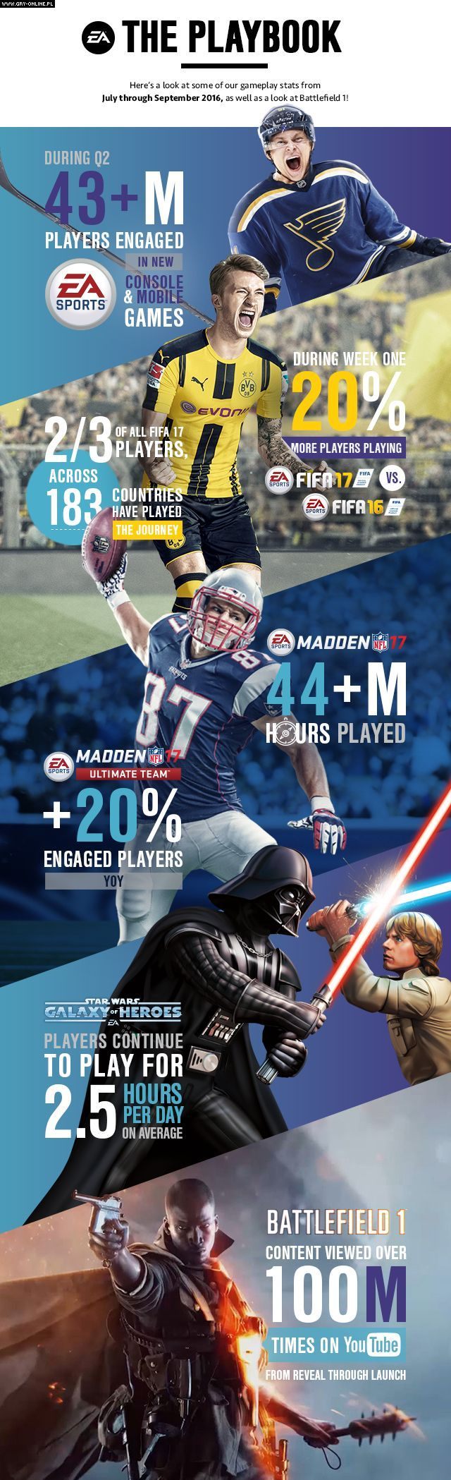 Spory udział w uzyskaniu lepszego wyniku finansowego w minionym kwartale miały produkcje mobilne, takie jak wspomniana wcześniej FIFA Mobile oraz Star Wars: Galaxy of Heroes. Ten ostatni tytuł wygenerował 100 milionów dolarów przychodu i może pochwalić się ponad 30 milionami pobrań od premiery, zainteresowaniem grających (średnio 2,5 godziny zabawy dziennie), a także prawie milionem recenzji w sklepie Google Play. W tekście wspomniano też, że z produkcjami mobilnymi oraz konsolowymi od EA Sports zapoznały się ponad 43 miliony graczy. Poniżej możecie zobaczyć infografikę, na której zaprezentowano niektóre z ciekawszych informacji.