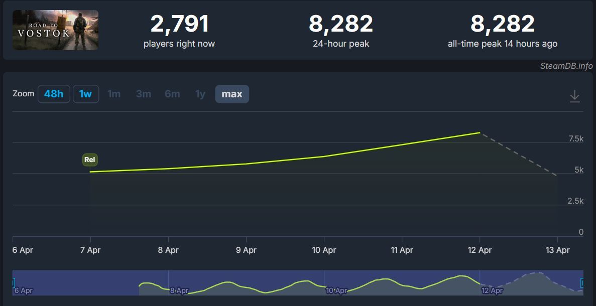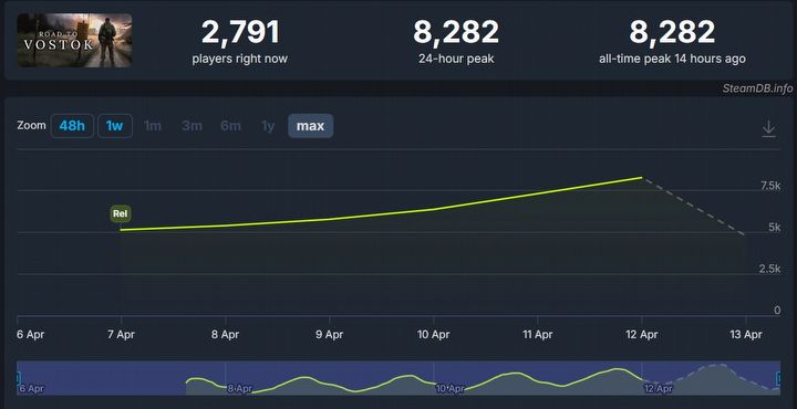 Do powyższych statystyk warto dodać również rekordową liczbę graczy na Steamie. Wczoraj, w szczytowym momencie, w Road to Vostok bawiły się jednocześnie 8 282 osoby.