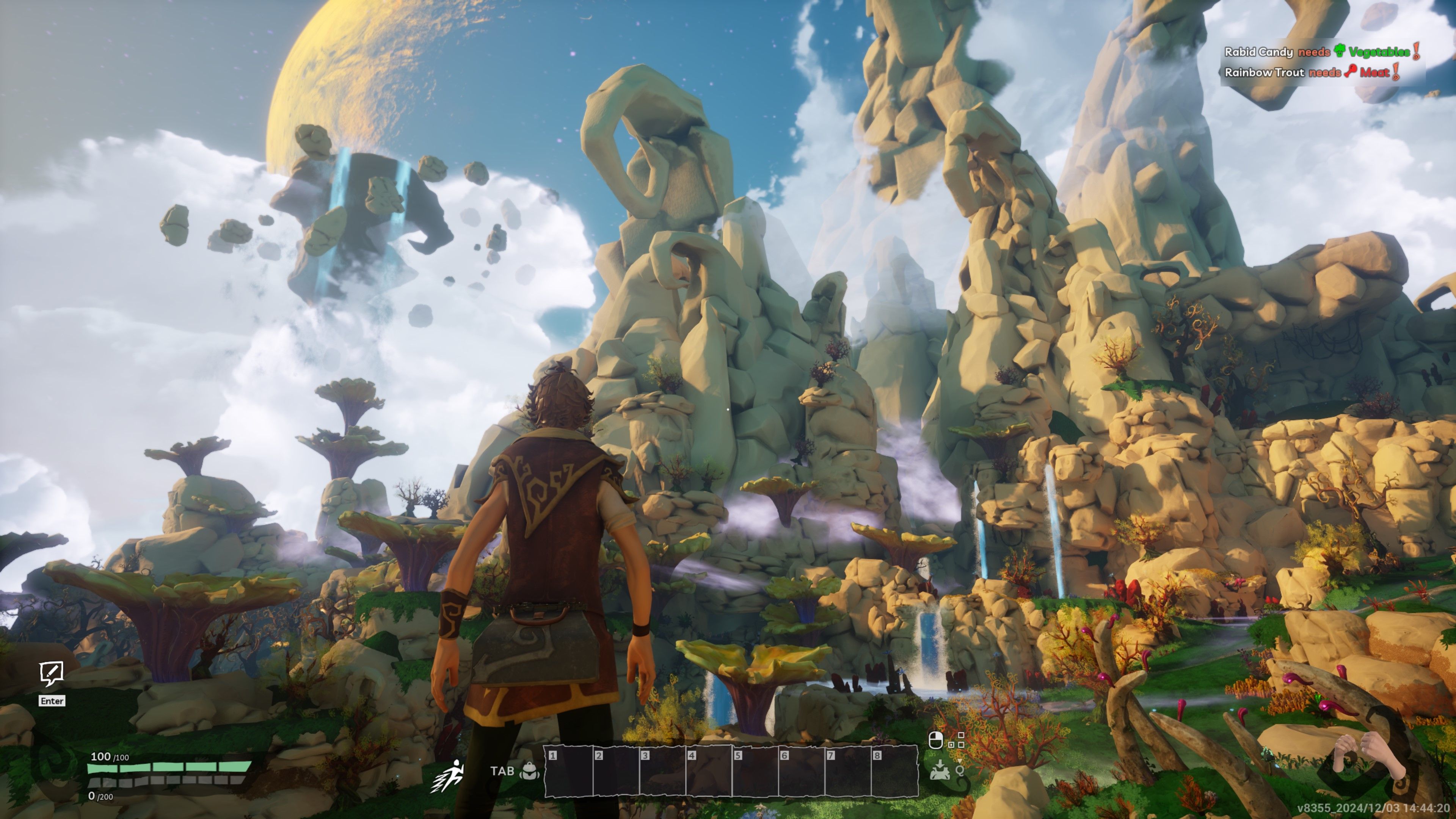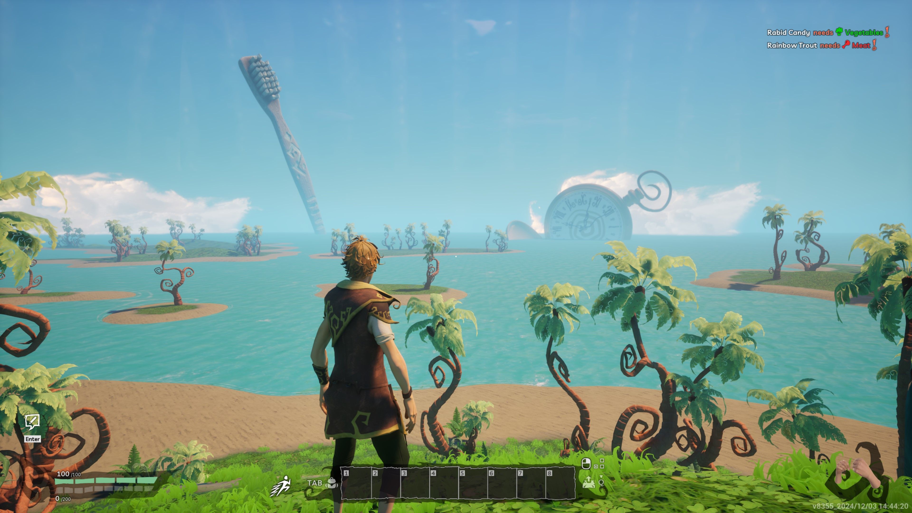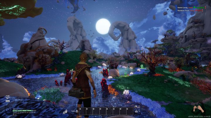 Dość szybko nałapałem do torby słodkich królików i tęczowych ryb, które potem radośnie przemierzały moją wyspę i otaczające ją wody. Pstrągi można nawet karmić (króliki nie chciały jeść, mimo dawania im warzyw, najwidoczniej to kwestia dema, błędu lub po prostu są cholernie wybredne). Domyślam się, że w przyszłości będzie można hodować więcej zwierząt, dzięki czemu pozyskamy surowce bez ich zabijania. Takie podejście niezwykle mi się podoba.
