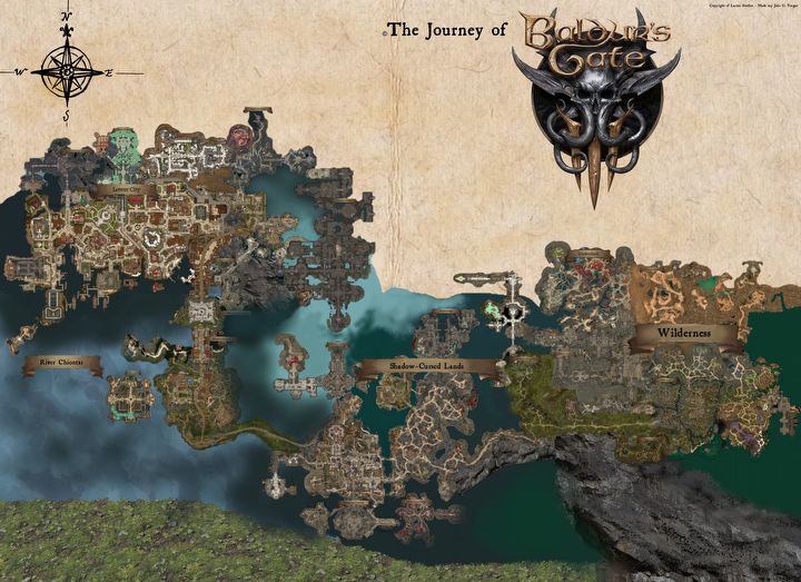 Niestety, nawet po tym mapa jest rozmazana, jako że gracz musiał pożytkować się zasobami serwisu Map Genie, by stworzyć ten plakat (który zresztą szybko wydrukował po naniesieniu poprawek). Oczywiście autor nie mógł też pomieścić wszystkich ważnych miejsc. Niektóre były po prostu zbyt małe (na przykład różne obozy), a inne trudno uznać za część fizycznego świata BG 3, więc uwzględnianie ich na mapie nie miałoby większego sensu.