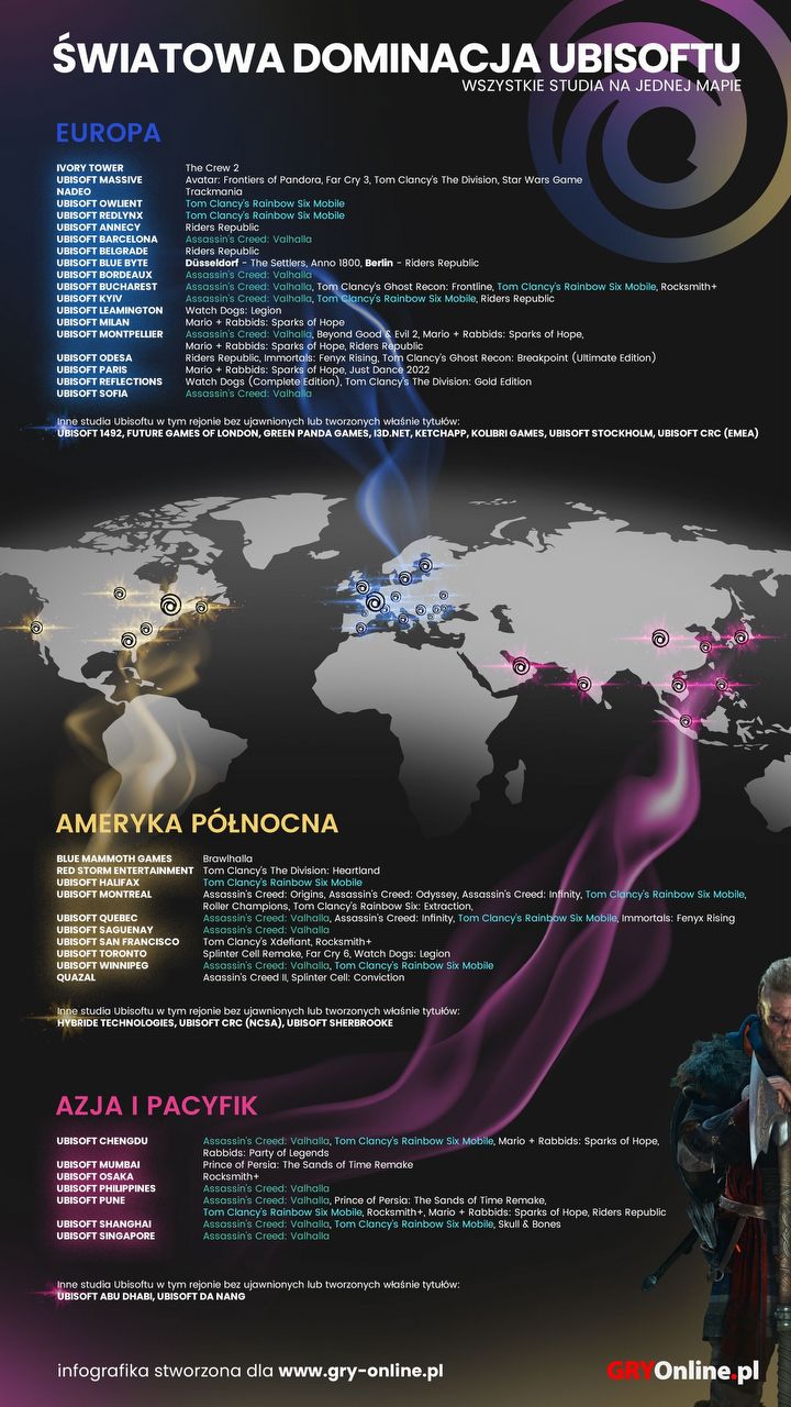 Assassin’s Creed: Valhalla, Far Cry 6, Rainbow Six: Extraction, Avatar: Frontiers of Pandora, The Crew 2 – to wszystko gry Ubisoftu. Bogate portfolio firmy to efekt jej olbrzymiej dominacji, wynikającej z posiadania kilkudziesięciu studiów na całym świecie. Przedstawiliśmy je na jednej grafice.