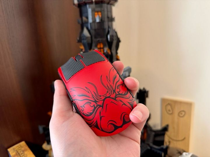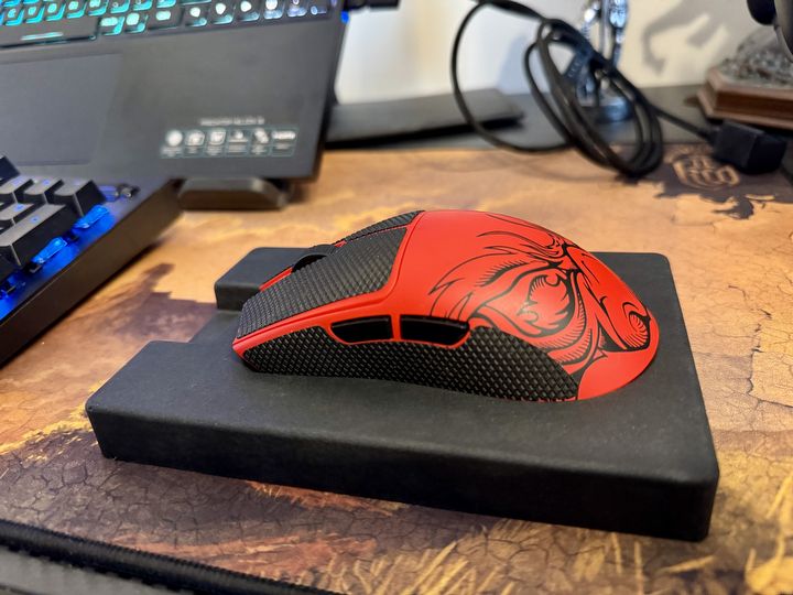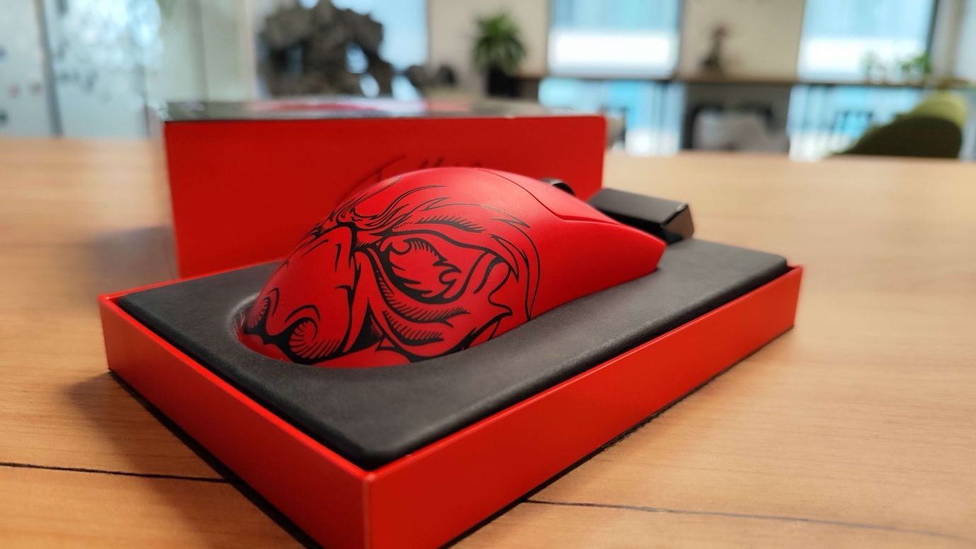 Razer wziął jedną ze swoich najbardziej zaawansowanych myszek i ubrał ją w ładne szaty. Grafika inspirowana motywem „Unkillable Demon King” wzbogacona jest podpisem Fakera na prawym przycisku. To nie jest pierwsza tego typu kolaboracja (mieliśmy już DeathAdder V3 Pro Faker Edition), więc mniej więcej wiedziałem czego się spodziewać.