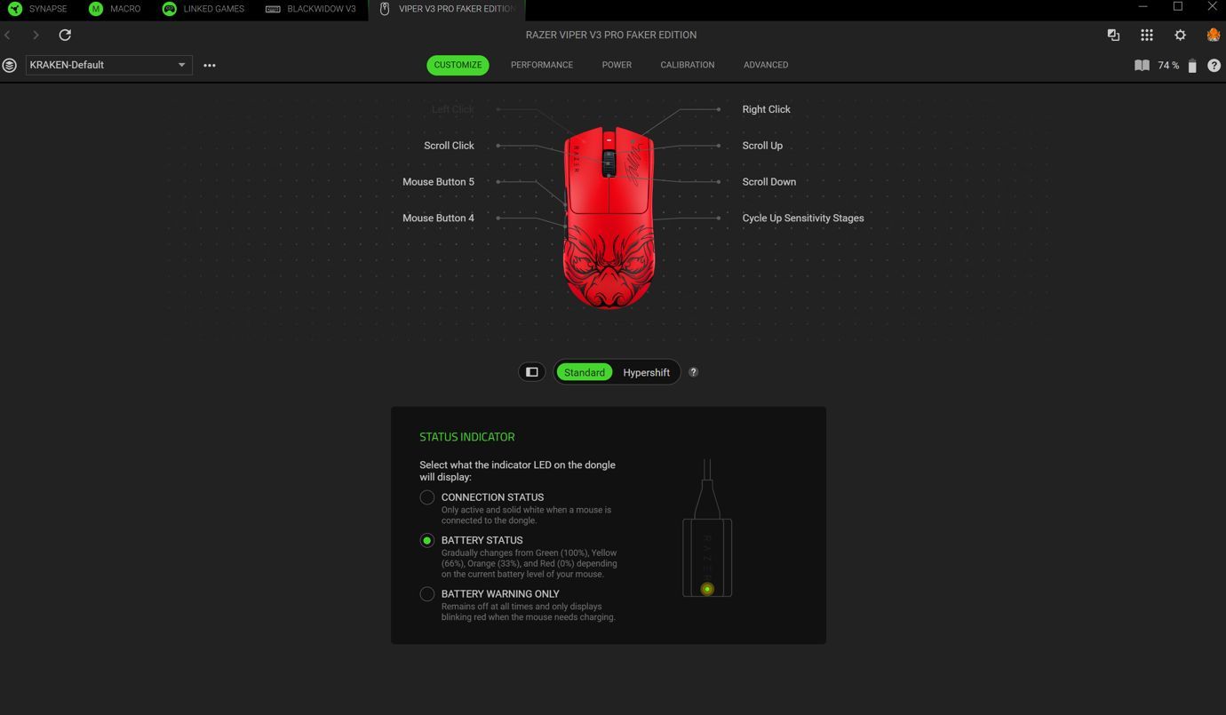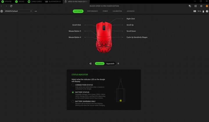Mysz Razer Viper V3 Pro ma symetryczny kształt dla osób praworęcznych, który najlepiej sprawdza się w przypadku chwytu typu Claw/Fingertip. Identycznie jest w wersji Faker Edition, bo nie licząc zmienionej obudowy, nie mamy tutaj żadnych zmian sprzętowych. Pod spodem mamy jeden przycisk odpowiedzialny za aktywację urządzenia oraz zmianę DPI. Nie mamy tutaj żadnego RGB, ale wyłącznie niewielki wskaźnik informujący nas o wybranym domyślnym trybie czułości czy poziomie naładowania akumulatora.