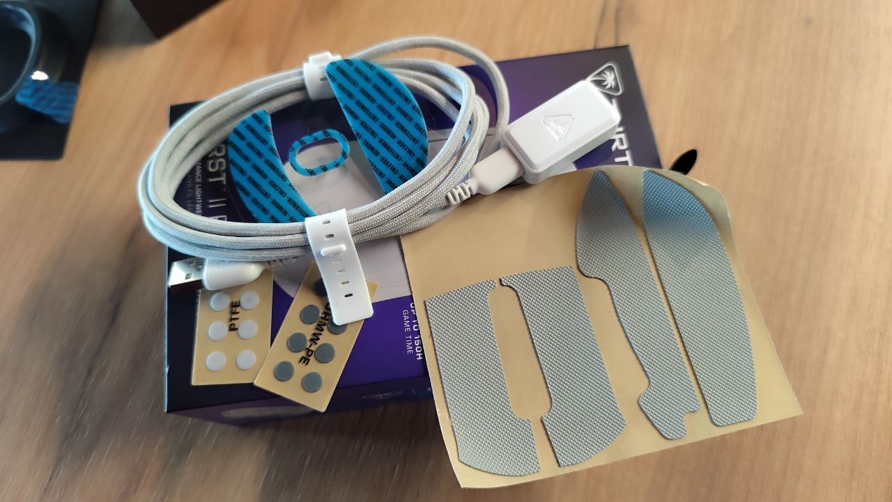 W pudełku znalazłem także dodatkowe elementy pod postacią ślizgaczy wykonanych z PTFE (politetrafluoroetylen, czyli materiał z wyjątkową odpornością termiczną oraz niskim współczynnikiem tarcia), kolejny pakiet ślizgaczy z 8 kropkami i trwałe ślizgacze UHMW-PE z 8 kropkami do szklanych podkładek pod mysz. Ponadto w zestawie znajduje się taśma chwytna (grip tape) zapewniająca bardziej spersonalizowane dopasowanie i czucie.