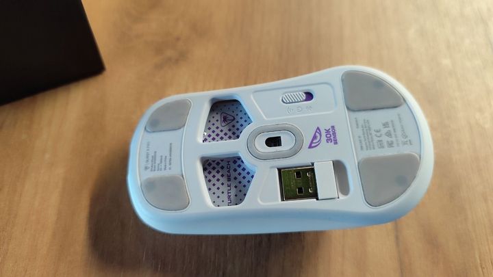Pod spodem znajdziemy heksagonalne wycięcia, które służą obniżeniu wagi, oraz dedykowane miejsce dla dongla, aby ten nie zaginął w trakcie przenoszenia sprzętu. Liczba samych klawiszy jest minimalistyczna i oprócz dwóch głównych przycisków bocznych, znajdziemy na Burst II Pro tylko jeden dodatkowy do zmiany DPI bez potrzeby instalowania dodatkowego oprogramowania. Całość konstrukcji jest bardzo lekka i waży ok. 57 gramów.