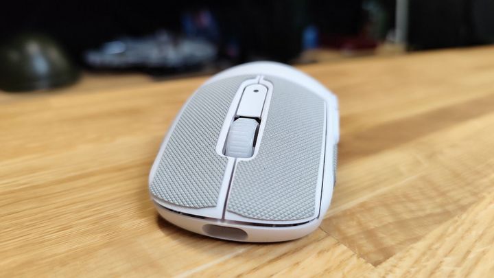 Najsłabszym elementem budowy gryzonia jest scroll. To nie jest typowy, elegancki przedstawiciel kółek z gumowym obiciem pośrodku. Tutaj dostajemy po prostu kawałek okrągłego plastiku z wyciętymi rowkami. Jest to o tyle bolesne, że inne elementy są na bardzo wysokim poziomie i nie bardzo rozumiem, czemu zdecydowano się na takie rozwiązanie w myszce kosztującej blisko 700 złotych.