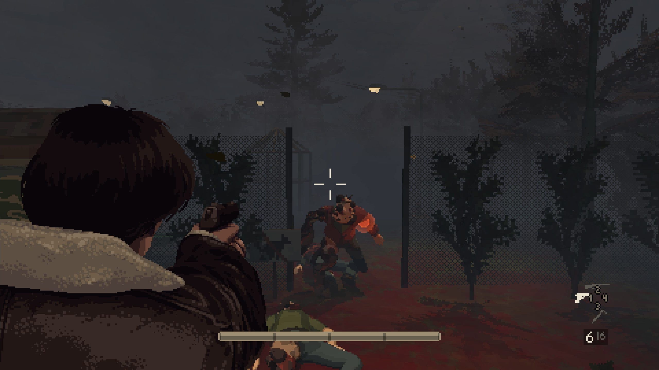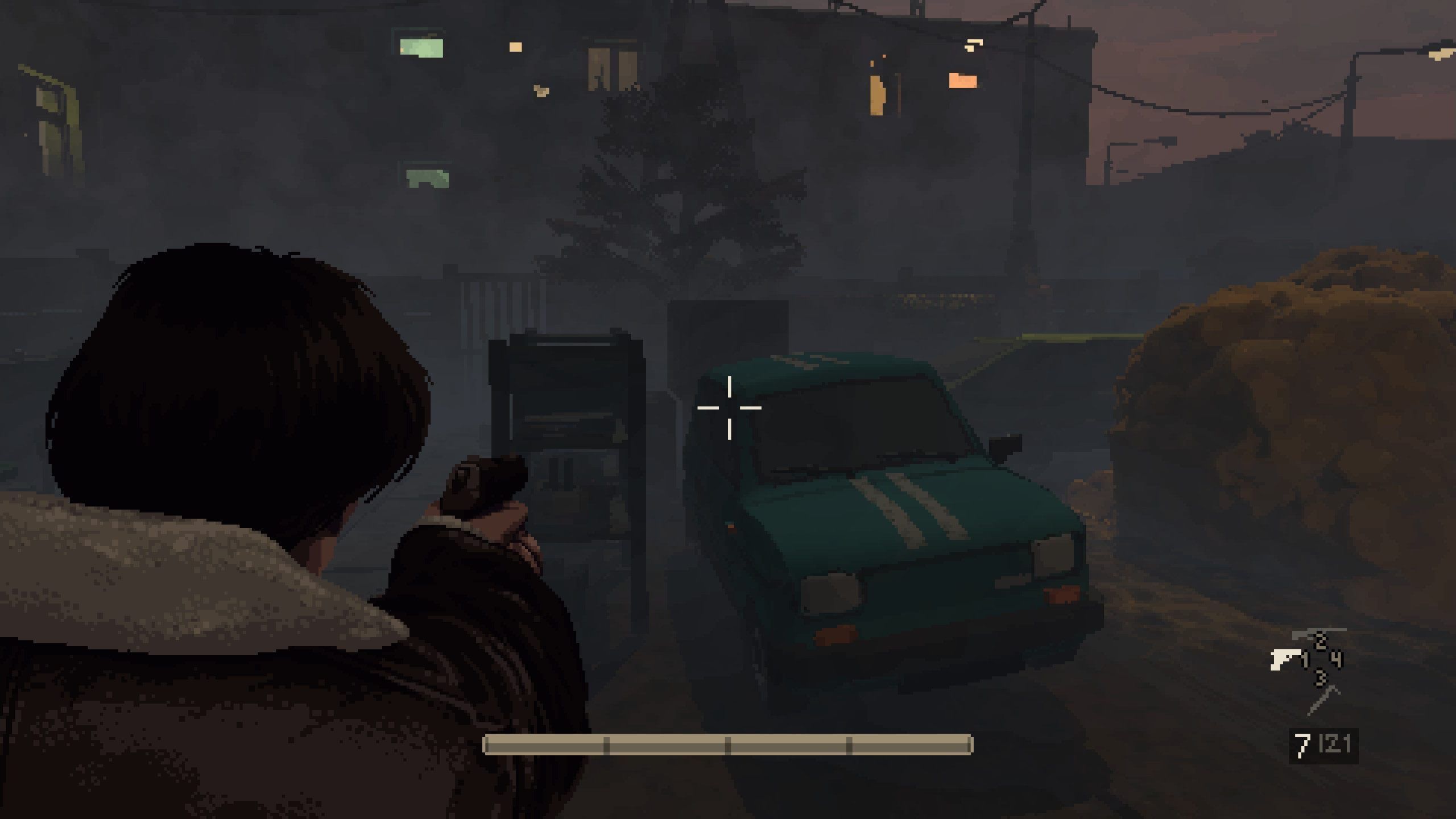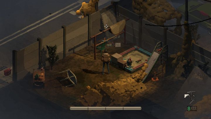 Mroczny, pixelartowy styl tej produkcji doskonale pasuje do wybranych przez deweloperów realiów, ale zaznaczmy, że mamy tu pełne 3D z możliwością obracania kamery zawieszonej nad planszą, ze świetną implementacją światła oraz twistem, którego użycie po raz pierwszy powoduje głupkowaty opad szczęki. Otóż w przypadku walki, po wciśnięciu prawego przycisku myszy odpowiedzialnego za celowanie, gra przechodzi do widoku zza ramienia bohatera. Robi to ogromne wrażenie tak swoją płynnością, jak i perspektywą – odkrywamy bowiem, że w ten sposób jesteśmy w stanie oglądać te wszystkie pomieszczenia, ulice i detale dawnej Polski z bliska. Spodziewałem się, że walka będzie najsłabszym elementem gry, tymczasem przeciwnie – jest jednym z najmocniejszych. Płynna tranzycja perspektywy i celowanie w słabe punkty zapewniają mnóstwo dzikiej radości, a fakt, że gra za sprawą pixel artu (i tematyki) „udaje” zabytek z lat 90, dodatkowo szokuje. To naprawdę współczesna produkcja, która w bebechach ma mnóstwo świetnie zaimplementowanych rozwiązań.