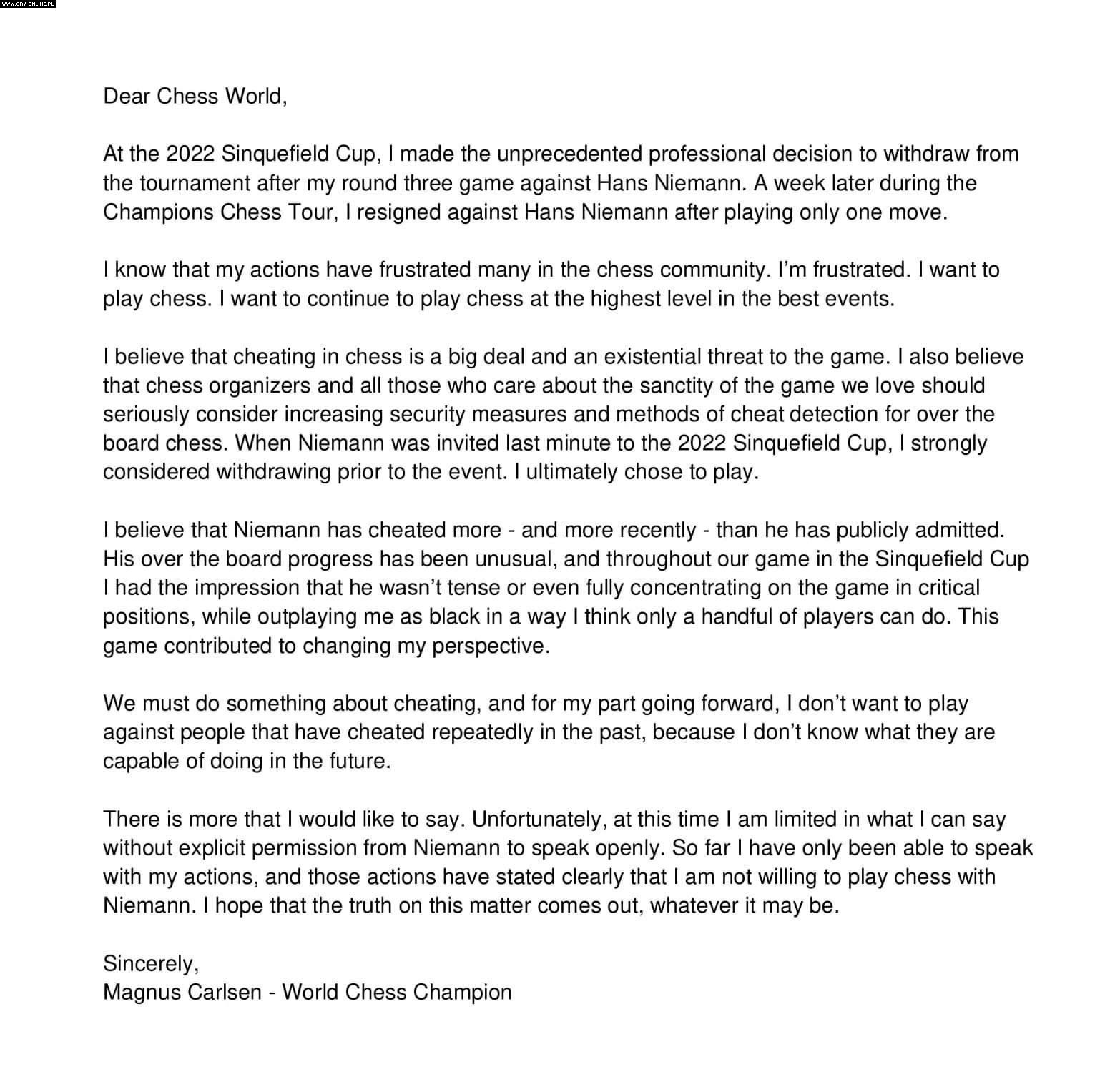 Jestem przekonany, że oszukiwanie w szachach jest dużym problemem, który stanowi bardzo poważne zagrożenie dla istnienia tej gry. Uważam również, że organizatorzy wydarzeń szachowych oraz wszyscy, którym zależy na nienaruszalności gry, którą kochamy, powinni poważnie rozważyć zwiększenie środków bezpieczeństwa i sposobów wykrywania oszustw podczas partii rozgrywanych na żywo przy szachownicy. Gdy Niemann został w ostatniej chwili zaproszony na turniej Sinquefield Cup 2022, poważnie zastanawiałem się nad wycofaniem się jeszcze przed rozpoczęciem zawodów. Ostatecznie zdecydowałem, że zagram.
