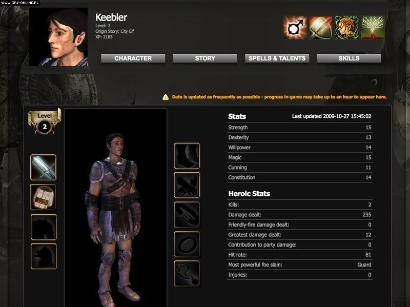 Podstawą wyświetlania informacji o postępie naszych przygód w świecie królestwa Ferelden będzie strona z dokładnymi danymi o naszym bohaterze. Znajdzie się na niej nie tylko stworzony przez nas w grze wizerunek herosa, ale również aktualnie posiadane przedmioty, umiejętności czy statystyki. Dobrze prezentuje to zamieszczony poniżej obrazek: