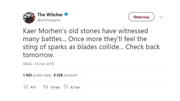 Nieco ponad tydzień temu informowaliśmy, że wiedźmin Geralt jeszcze w tym roku pojawi się w nowej grze. Jak wyjawił Marcin Momot, specjalista od kontaktów ze społecznością w CD Project Red, Biały Wilk zawita do produkcji niezwiązanej z wiedźmińskim cyklem jeszcze w tym roku. Dziś na oficjalnym koncie The Witcher w serwisie Twitter pojawił się enigmatyczny wpis dający do zrozumienia, że już jutro dowiemy się więcej na temat obecności nie tylko Geralta, ale również twierdzy Kaer Morhen w nadchodzącej grze spoza cyklu.