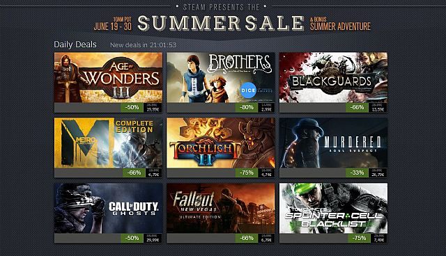 To już szósty dzień wakacyjnej wyprzedaży w serwisie Steam. Taniej możemy kupić m.in.gry Metro: Last Light, Age of Wonders III, Murdered Soul Suspect, Fallout: New Vegas czy Brothers: A Tale of Two Sons. Oprócz ofert dnia na graczy czekają również błyskawiczne okazje oraz tytuły wybrane przez społeczność.