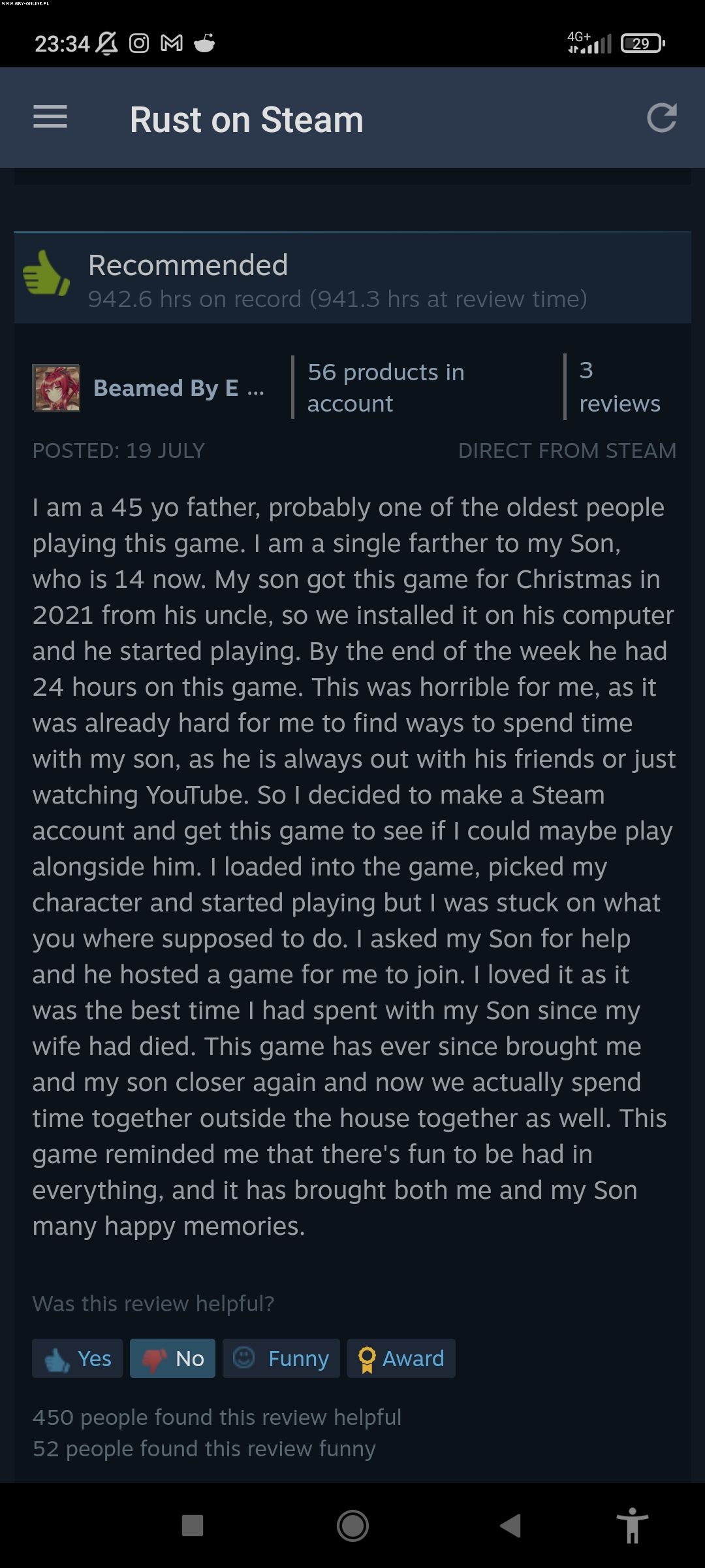Jestem 45-letnim ojcem, najpewniej jedną z najstarszych osób grających w tę grę [Rust – dop. red.]. Samotnie wychowuję 14-letniego syna. Dostał tę grę na gwiazdkę w 2021 roku od swojego wujka, zainstalowaliśmy ją i zaczął grać. Na koniec tygodnia miał 24 przegrane godziny. To było dla mnie druzgocące, jako że już miałem problem, aby znaleźć chwilę, którą mogę spędzić z synem [...].