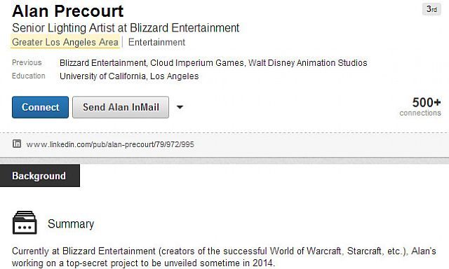 Po tegorocznej premierze Hearthstone: Heroes of Warcraft oraz pierwszego dodatku dla Diablo III, firma Blizzard pracuje w tej chwili nad co najmniej trzema grami. Jest nią ostatnia odsłona trylogii StarCraft II (Legacy of the Void), MOBA Heroes of the Storm oraz kolejne rozszerzenie dla niezatapialnego, ponad dziesięcioletniego World of Warcraft. Wciąż trwają też prace nad projektem Titan, który został zapowiedziany w 2006 roku. W pierwotnych zamierzeniach miał on być kolejnym wielkim sieciowym MMO studia. Być może do tej listy trzeba będzie dodać wkrótce kolejny tytuł. Jak zauważył serwis Kotaku, w skasowanym już profilu w serwisie LinkedIn, należącym do Alana Precourta, jednego z pracowników dewelopera, znalazła się wzmianka o super-tajnej produkcji, która ma zostać ujawniona w 2014 roku.