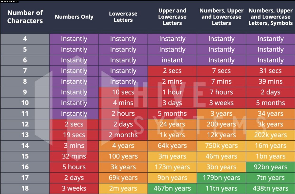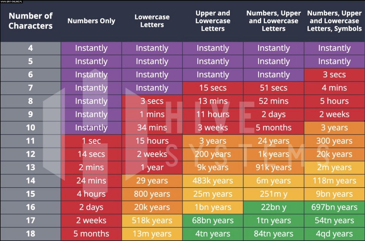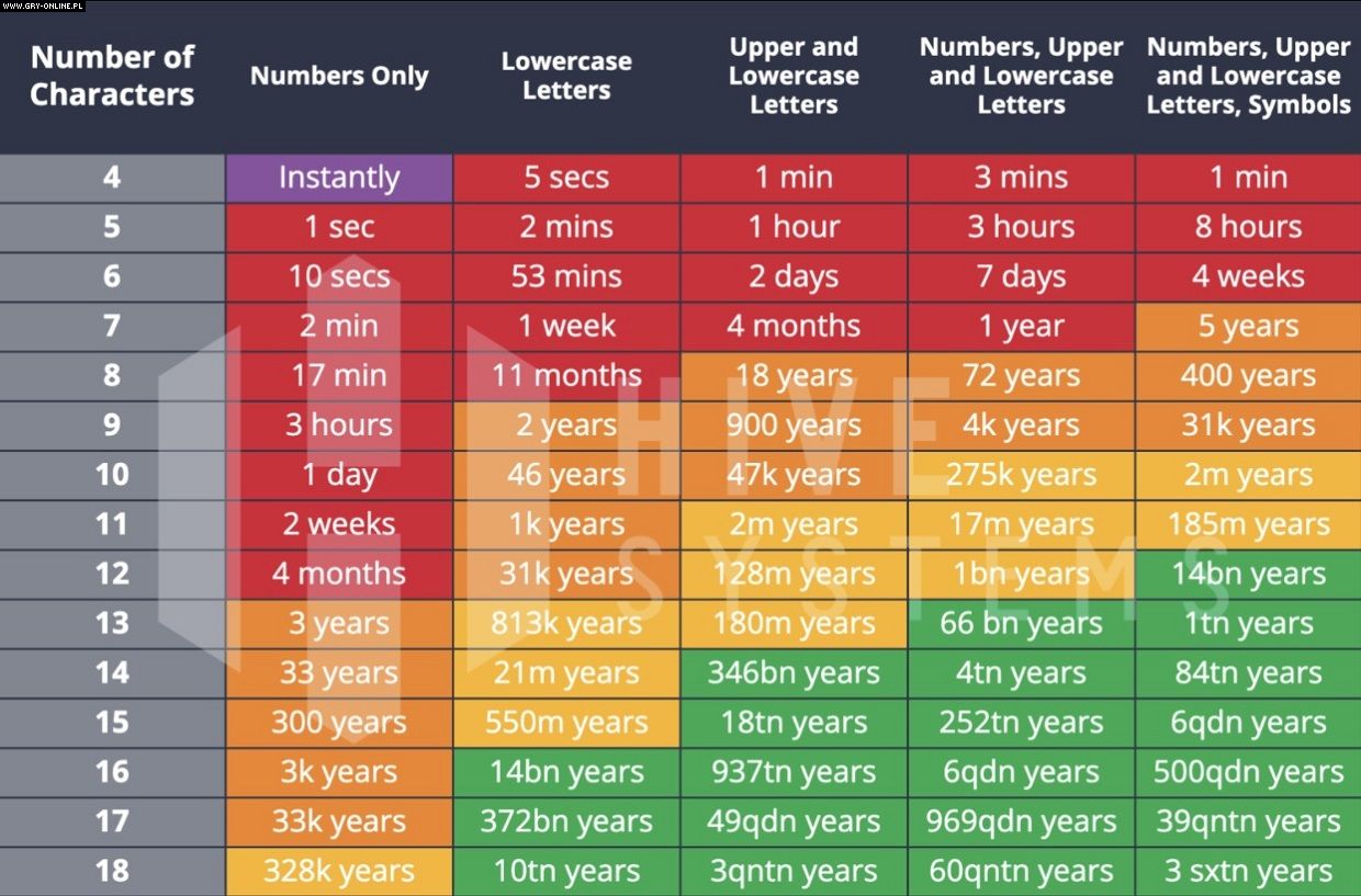 Tabelka (widoczna poniżej) przedstawia, ile czasu zajmie hakerowi złamanie hasła w zależności od jego kilku własności: liczby znaków, zastosowania wielkich i małych liter czy cyfr.