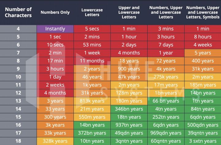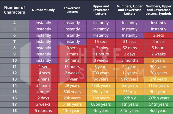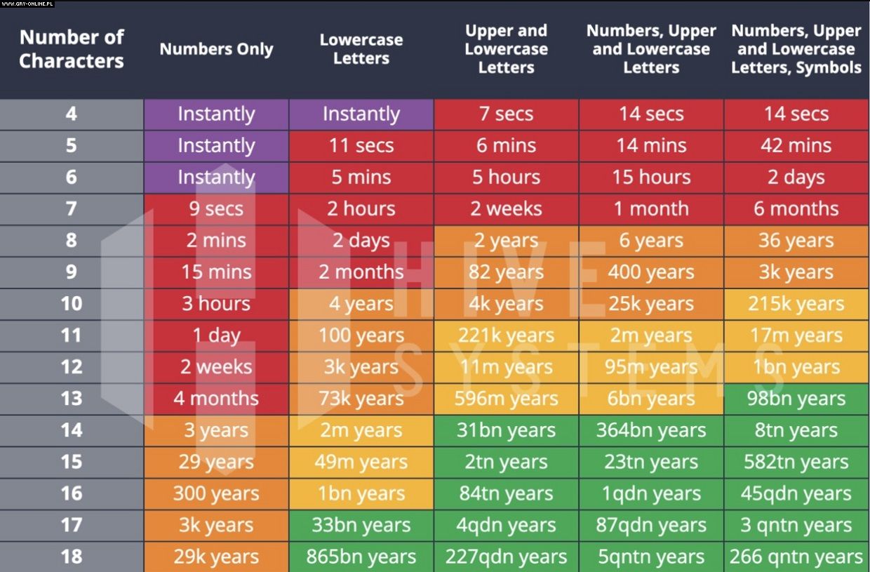 Firma Hivesystems, zajmująca się cyberbezpieczeństwem, przygotowała tabelkę pokazującą, jak szybko hakerzy mogą złamać Twoje hasła.