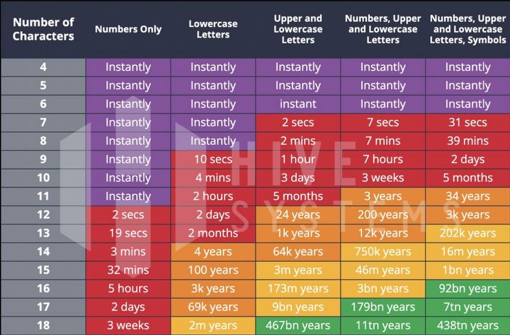Firma informatyczna Hivesystems, zajmująca się rozwiązaniami w zakresie cyberbezpieczeństwa, stworzyła odświeżoną tabelkę, która ukazuje hasła oraz czas potrzebny do ich złamania przez hakerów.