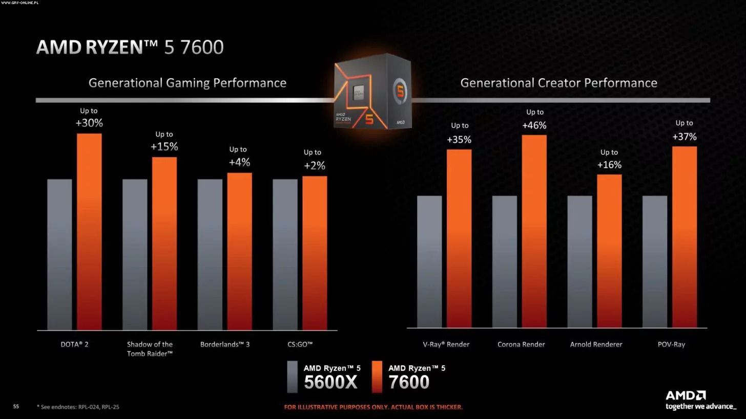 Ośmiordzeniowy Ryzen 7 7700 powinien radzić sobie lepiej od Ryzena 7 5800X. Z zapewnień AMD wynika, że nowe CPU będzie o 6–30% wydajniejsze od poprzednika. Najsłabszy model również ma szansę zapewnić lepsze osiągi w porównaniu z poprzednią generacją. Wydajność Ryzena 5 7600 w grach jest o 2–30% lepsza niż w przypadku modelu Ryzen 5 5600X.
