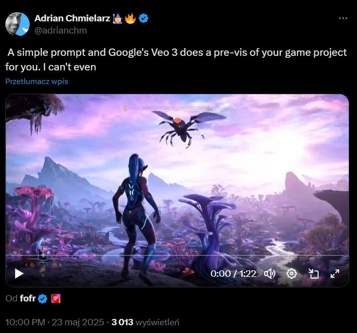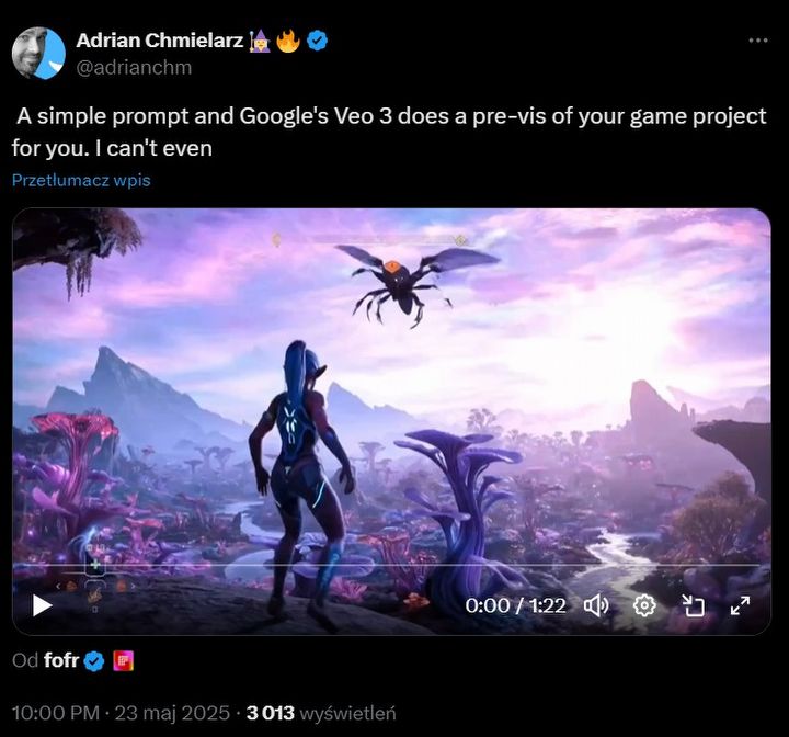 Prosty prompt, a Veo 3 od Google robi prewizualizację projektu gry za ciebie. Nie ogarniam. – tak film skomentował w serwisie X Adrian Chmielarz, współzałożyciel studia The Astronauts (Zaginięcie Ethana Cartera, Witchfire).