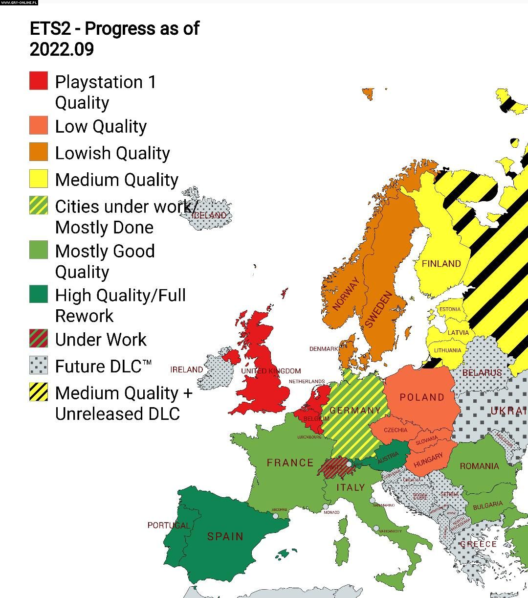 Gracz pepeJAM69 stworzył mapę, mającą zobrazować to, jak aktualnie mają się poszczególne kraje w ETS2. Skala zaczyna się od poziomu PlayStation 1 Quality, czyli najniższego, a idzie aż do High Quality/Full Rework, którym oznaczone zostały najlepiej wyglądające obszary.