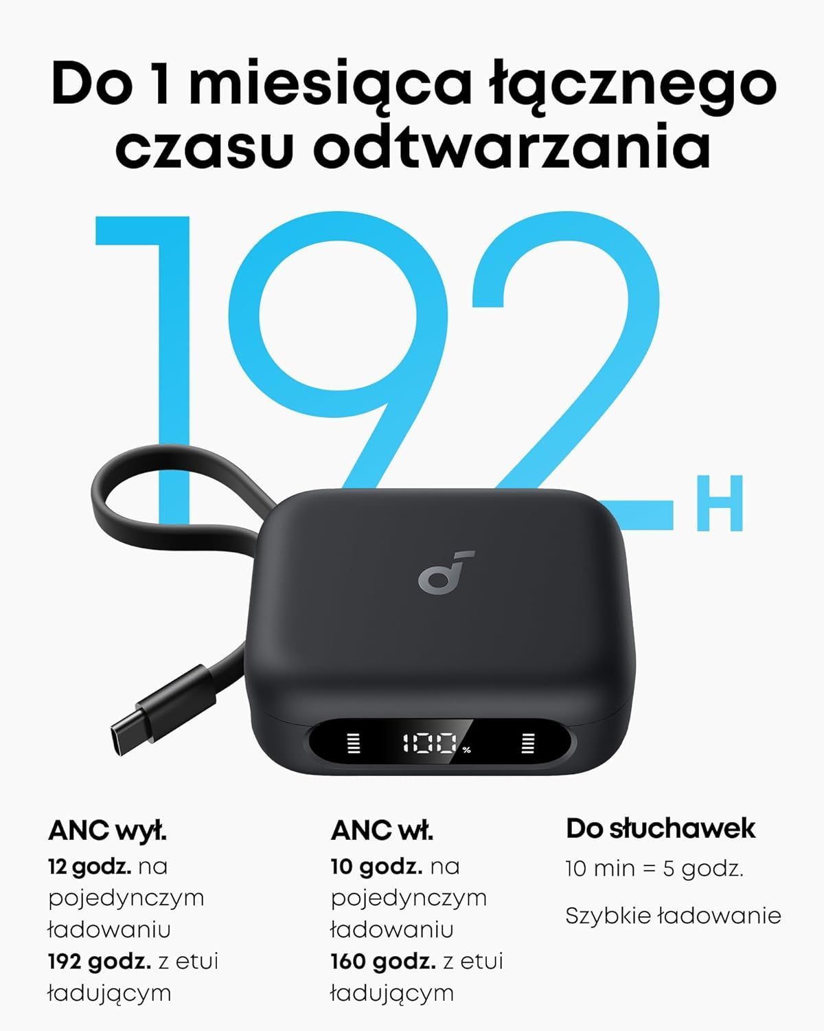Największe wrażenie robi czas pracy. Same słuchawki potrafią grać do 12 godzin na jednym ładowaniu (bez ANC) i około 10 godzin z włączoną aktywną redukcją szumów. Wynik sam w sobie imponujący, ale prawdziwa magia zaczyna się, gdy w grę wchodzi etui ładujące.