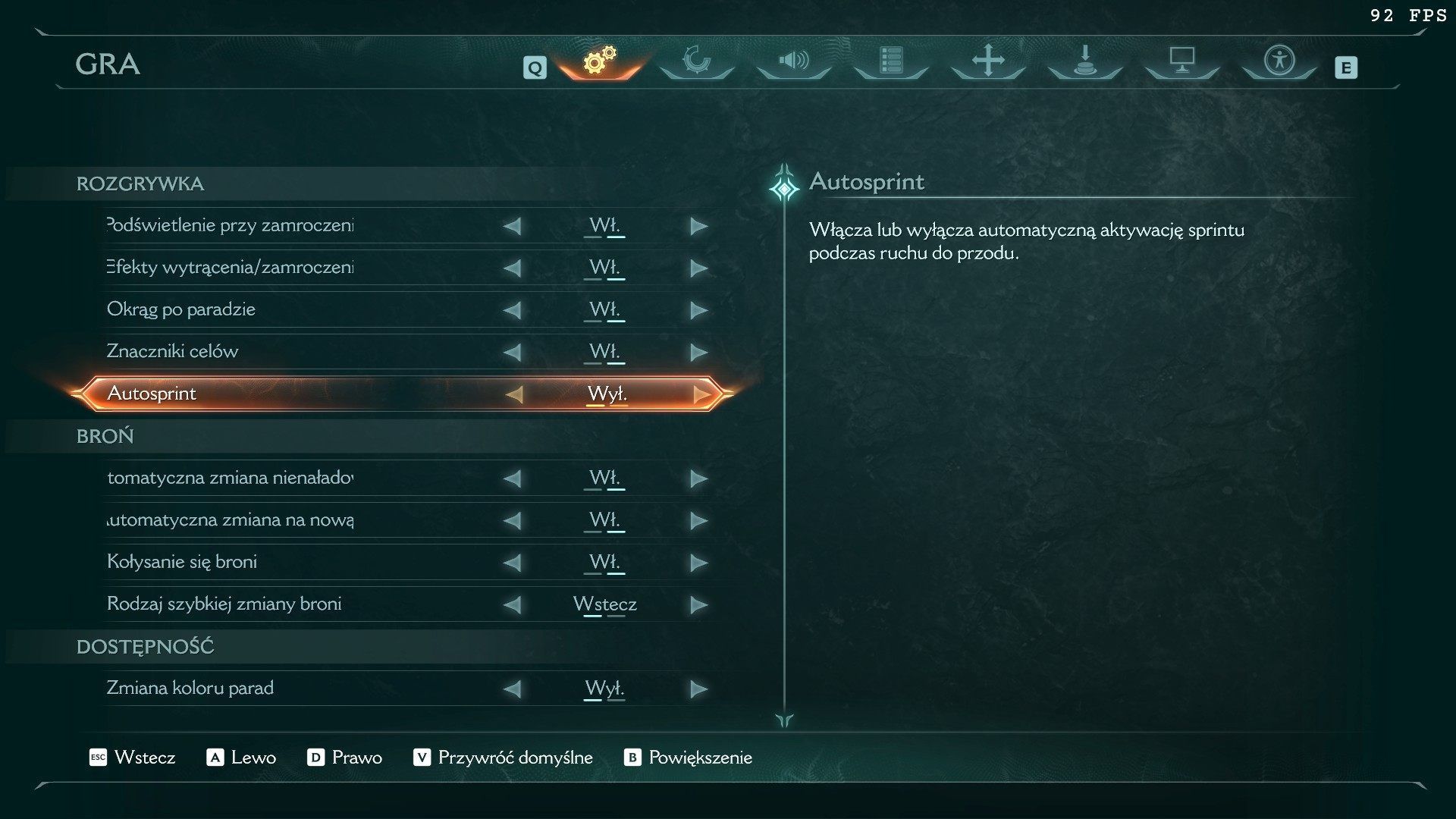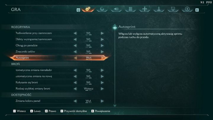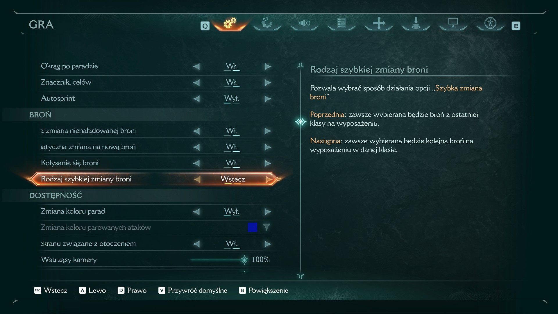 Kolejny parametr dotyczy działania przycisku szybkiej zmiany broni (na klawiaturze jest to domyślnie przycisk Q). Wybranie opcji „Wstecz” sprawi, że będziecie mogli szybko rotować pomiędzy dwiema ostatnio dzierżonymi pukawkami. Ustawienie parametru „Dalej” spowoduje natomiast, że przycisk szybkiej zmiany będzie wybierał dla was bronie z kolejnej klasy na kole szybkiego wyboru (zgodnie z ruchem wskazówek zegara).