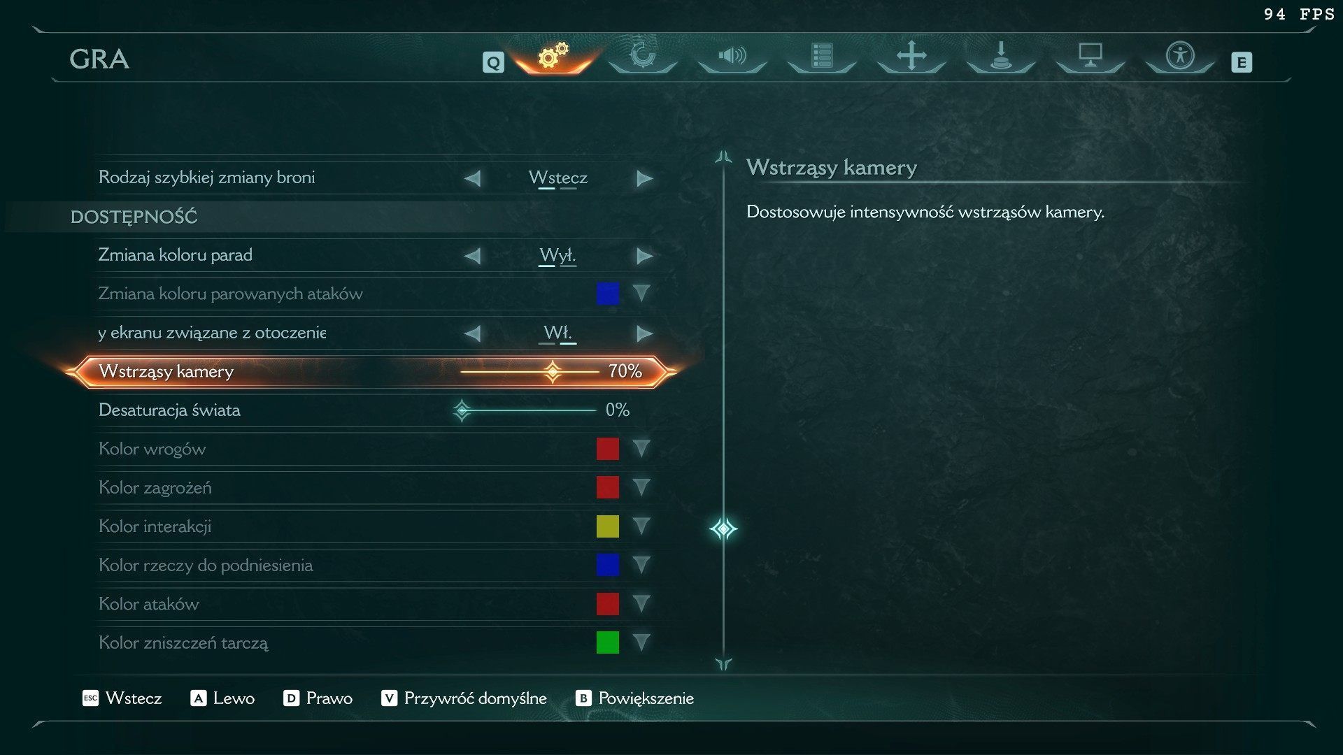 Drżąca kamera to przydatna funkcja, która może pomóc Wam np. w zorientowaniu się, kiedy dostajecie obrażenia. Jeżeli jednak jej intensywność jest dla Was zbyt rozpraszająca, możecie ją spokojnie ograniczyć (lub nawet wyłączyć) przestawiając odpowiedni suwak.
