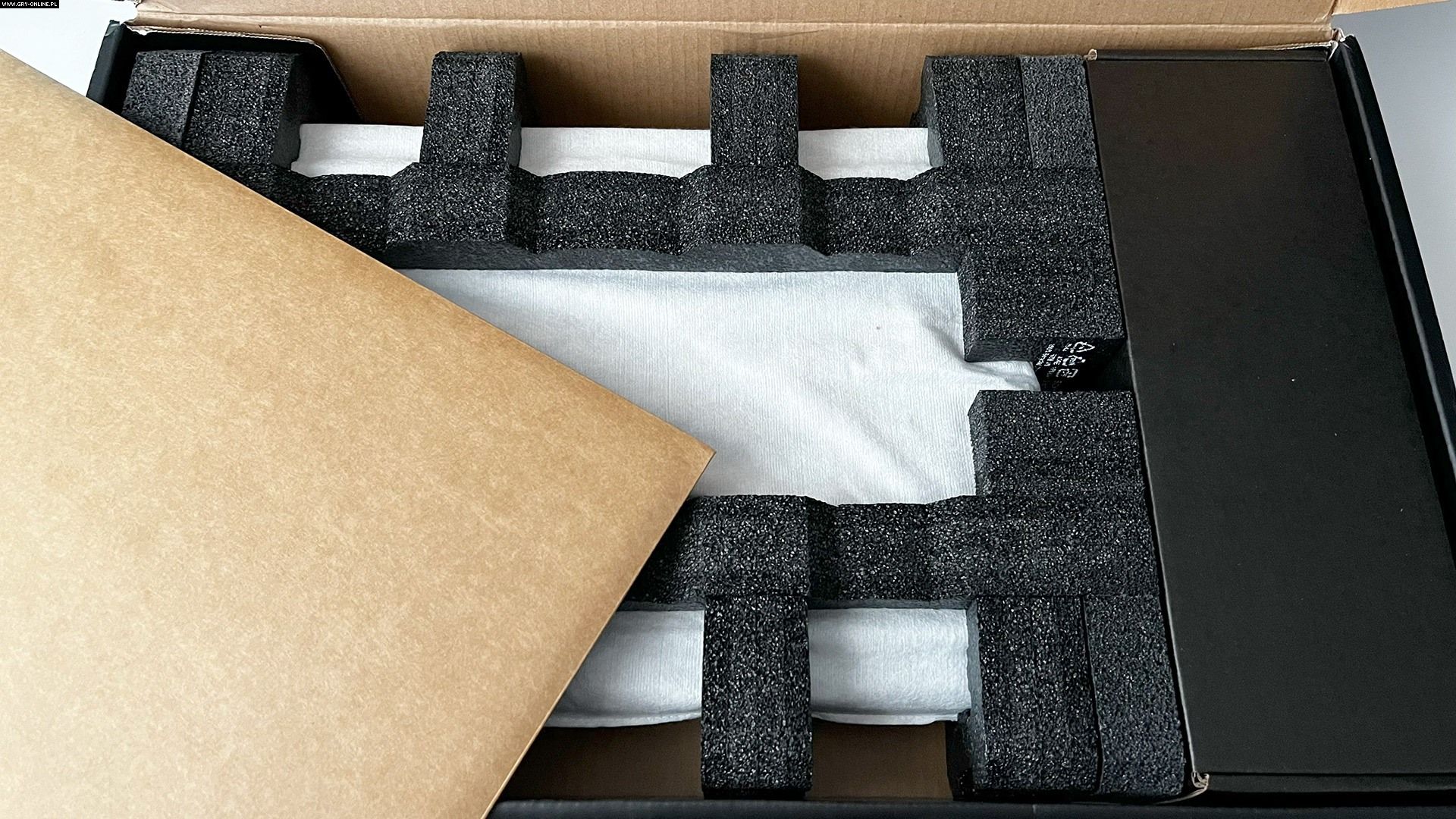 Unboxing w tym przypadku daleki jest od estetycznej uczty doświadczeń. Zwykła, tekturowa walizka skrywa szkielet z pianki chroniący laptopa zawiniętego w kawałek materiału. Obok, w osobnym kartonie znajduje się cegła zasilacza – dosłownie cegła, bo rozmiar jest praktycznie taki sam, jak cegły murarskiej, tyle że cieńszy o połowę. Na szczęście kabel, który idzie bezpośrednio do laptopa jest długi i cienki, a do gniazdka mamy osobno doczepiany, standardowy przewód zasilacza.