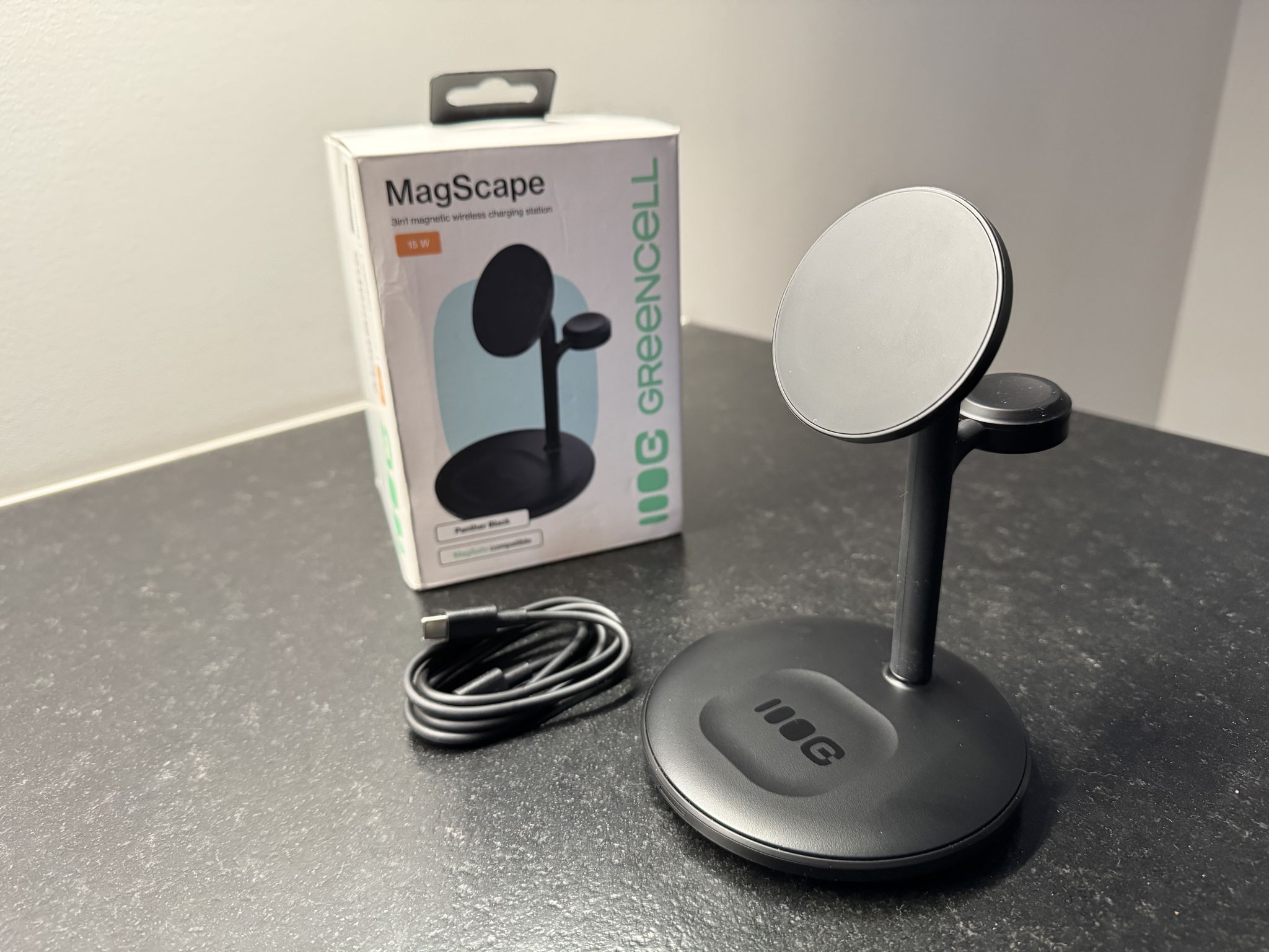 Greencell MagScape Stand 3w1 to urządzenie stworzone, by towarzyszyć nam na biurku lub szafce nocnej, które poza telefonem naładuje także zegarek i słuchawki. Dzięki temu zapanowanie nad kablami i liczbą wtyczek nie jest problemem, wszystko ogranicza się do jednego kabla, starczy też niewielka ładowarka z jednym wyjściem (nie jest dołączona do zestawu).