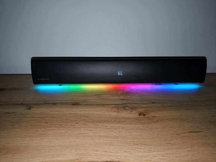 No dobrze, pora jednak napisać kilka słów o samym soundbarze. Creative Sound Blaster GS5 swoim wyglądem może cieszyć oko. Nie mamy tutaj do czynienia z żadnym krzykliwym designem. Jego prostota, a zarazem elegancja sprawia, że nie trzeba się go wstydzić. Duża w tym zasługa podświetlenia, które wprawia w idealny wręcz nastrój podczas seansu czy kolejnej partyjki ulubionej gry.