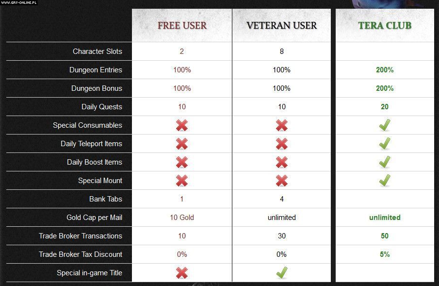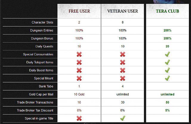 W nowym modelu gracze podzieleni zostaną na trzy sektory: darmowych użytkowników, weteranów oraz członków tzw. klubu TERA. Jak zapewnia wydawca, w odróżnieniu od innych dostępnych na rynku tytułów ograniczenia nałożone na bezpłatne konta nie będą w żaden sposób uniemożliwiały prowadzenia normalnej rozgrywki ani wyraźnie utrudniały pełnego doświadczania wszystkich dostępnych w produkcji elementów. Poszczególne rodzaje członkowstwa mają, w porównaniu do konkurencji, posiadać jedynie kosmetyczne odmienności. Szczegółowe informacje dotyczące owych zmian prezentujemy poniżej.