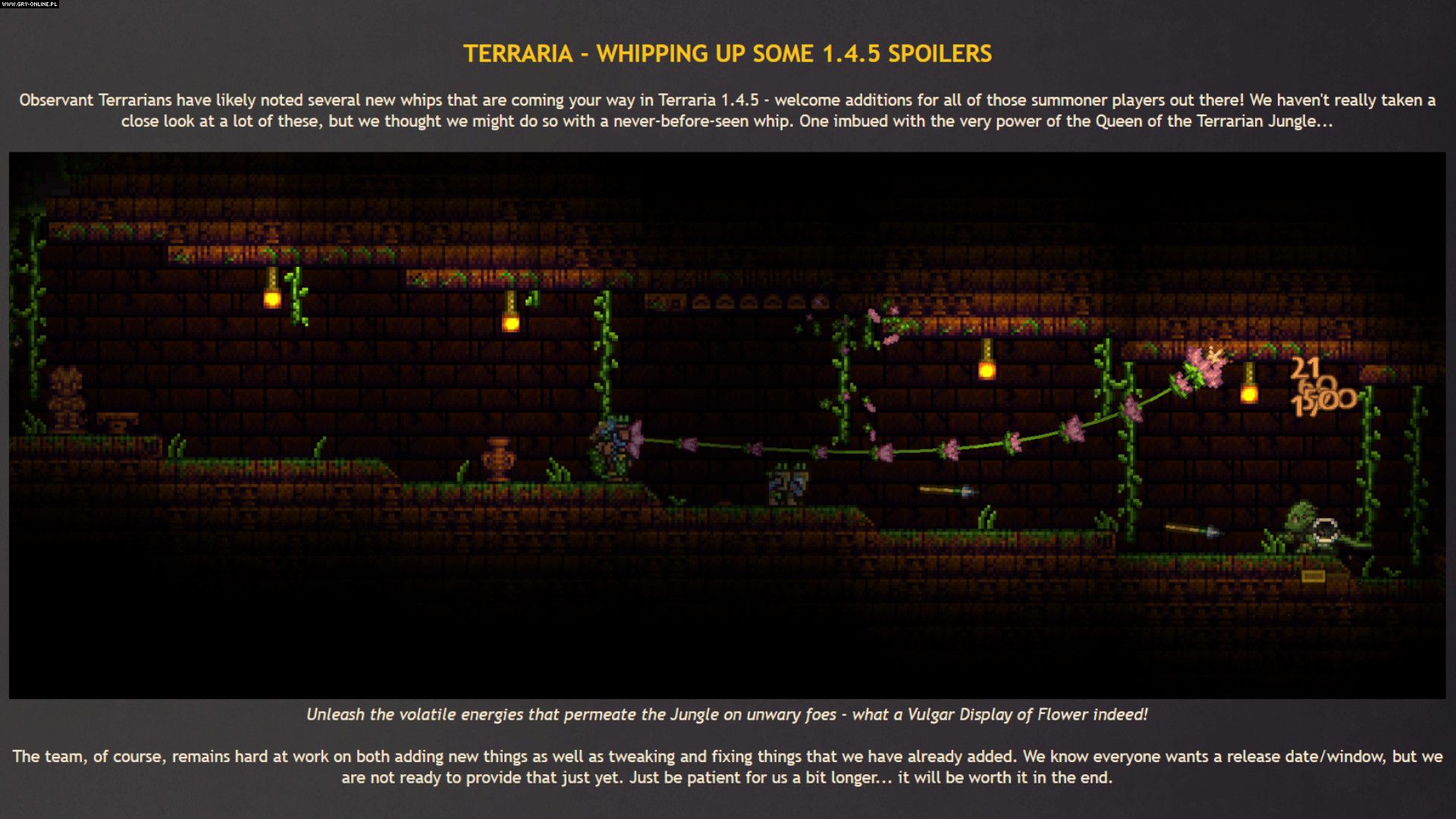 Niestety mimo ujawnionych nowości, twórcy ze studia Re-Logic wciąż nie są gotowi podać daty premiery patcha 1.4.5. Niemniej jego debiut wciąż jest planowany na bieżący rok – zapewne tuż pod jego koniec.