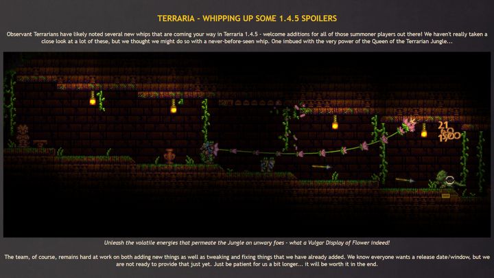 W ostatnim wpisie na oficjalnym forum gry twórcy zaprezentowali w akcji nową broń z klasy biczów. Warto zaznaczyć, że bicze w Terrarii to dość specyficzny typ uzbrojenia, głównie ze względu na właściwości do wzmacnia „przyzwańców”.