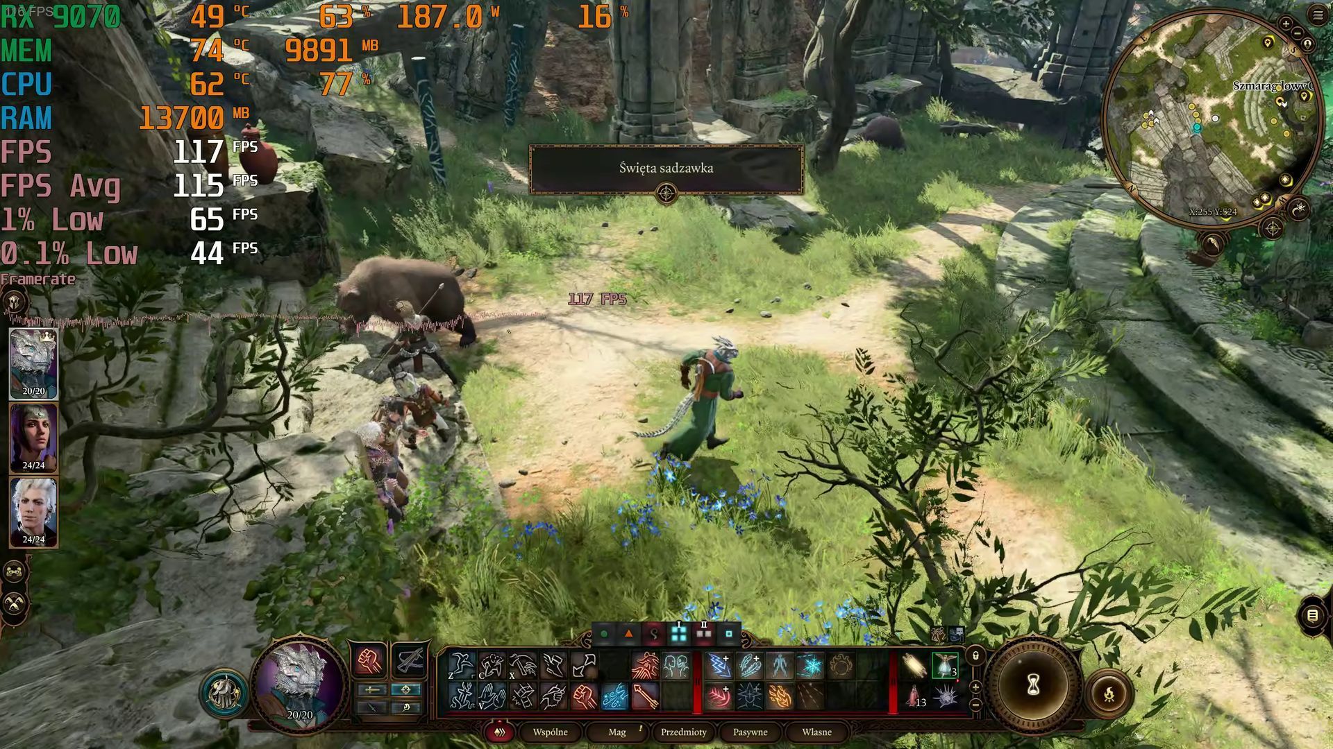 Podczas przechadzki po Gaju Druidów klatki utrzymywały się na bardzo zadowalającym poziomie. Tak pełna szczegółów produkcja jak Baldur’s Gate III sporo zyskuje w wyższych rozdzielczościach. Jeżeli więc posiadacie odpowiedni ekran, polecam Wam poświęcić nieco płynności dla dużo bardziej „krystalicznego” obrazu. I wówczas RX 9070 powinien sprostać takiemu zadaniu bezproblemowo.