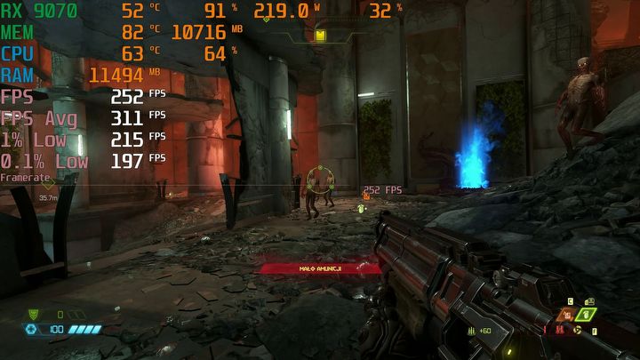Wyśmienita optymalizacja gry id Software sprawia, że w połączeniu z RX 9070 gra praktycznie nie zniża się do wartości FPS niższych niż wyniki trzycyfrowe, i to nawet przy włączonych efektach śledzenia promieni. W tak dynamicznej grze przekłada się na bardzo przyjemne wrażenia z rozgrywki, co odczują zwłaszcza posiadacze monitorów będących w stanie wyświetlić więcej niż 240 ramek na sekundę.