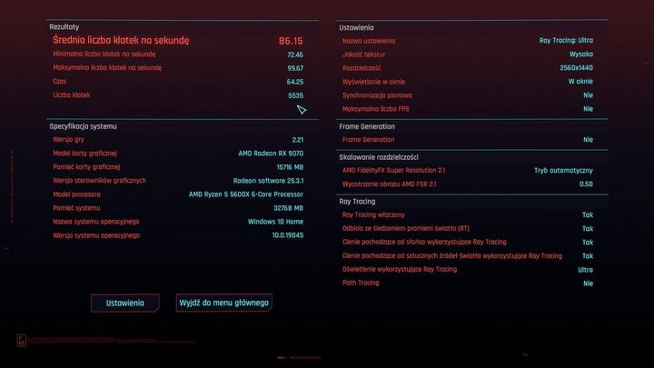 Szybkie ustawienia: RayTracing Ultra / Path Tracing: OFF / Skalowanie rozdzielczości: AMD FSR 2.1 (tryb automatyczny) / Frame Generation: OFF
