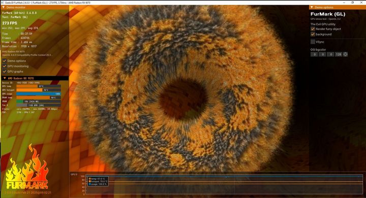 RX 9070 w wersji od Sapphire w czasie testów cechował się bardzo przyzwoitą kulturą pracy. Po 30 minutach stress testu w programie FurMark, karta rozgrzała się do 57 stopni Celsjusza, osiągając w najgorętszym miejscu 70 stopni. Kości VRAM w międzyczasie osiągnęły okolice 90 stopni. Biorąc pod uwagę syntetyczną naturę benchmarku, wyniki te uważam za bardzo dobre.