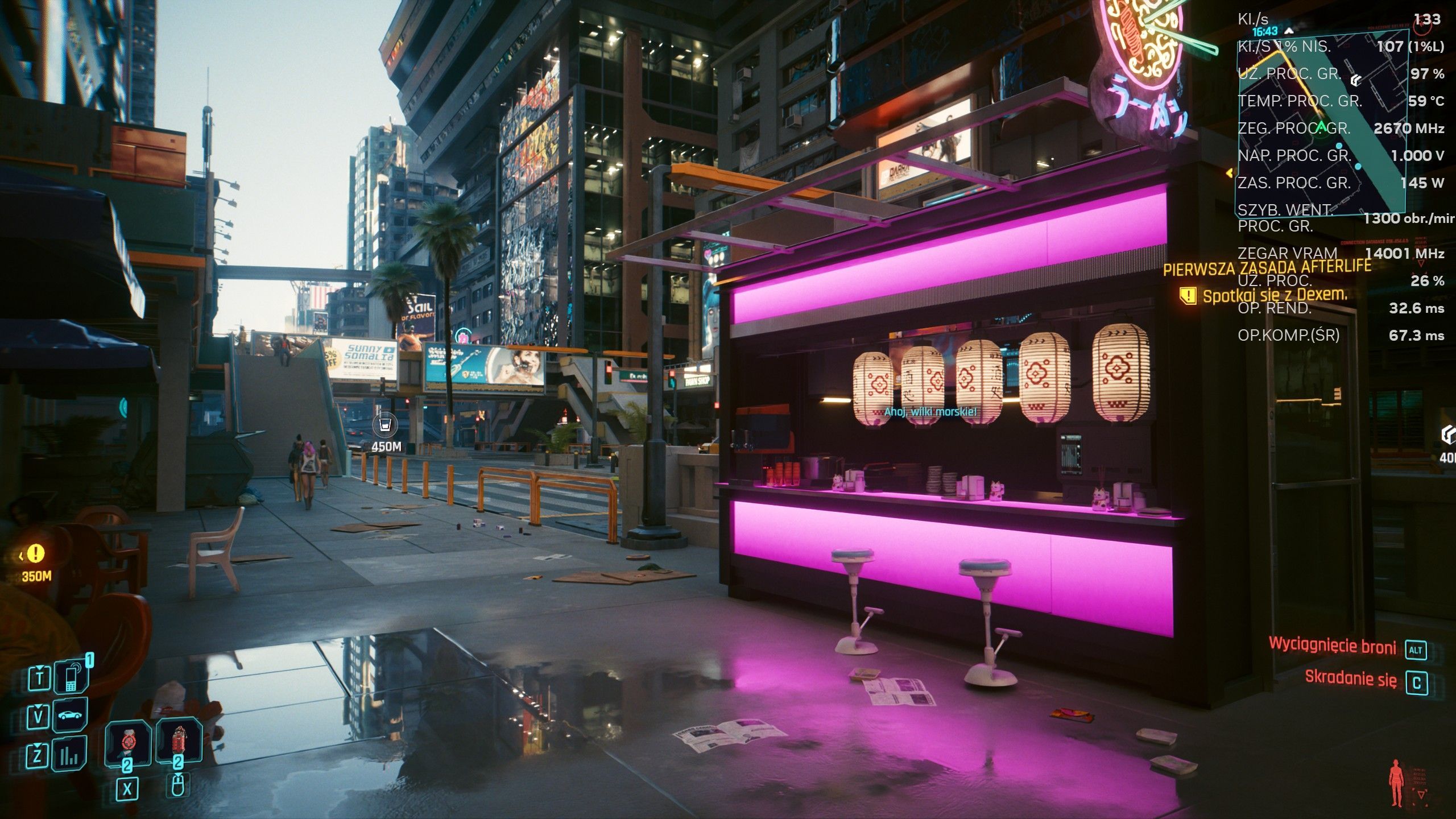 Spójrzcie tylko na te FPS, potem na kałużę, potem znów na FPS.Źródło: Cyberpunk 2077, CD Projekt RED, 2020.