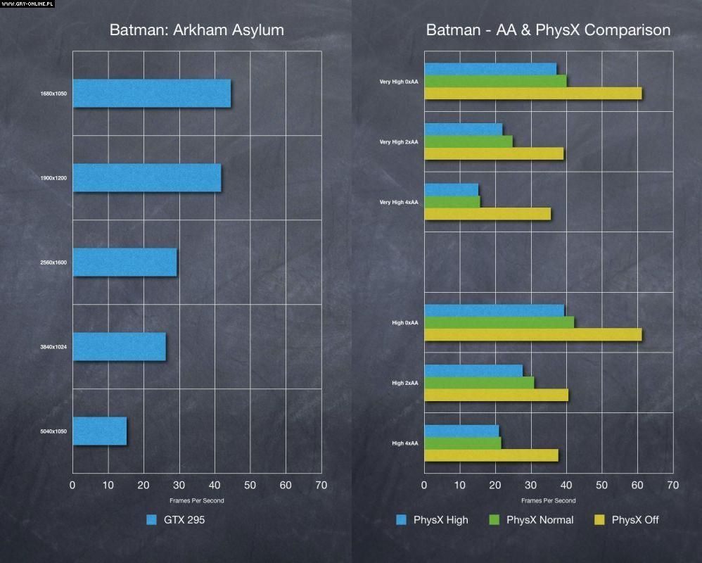 Zupełnie inaczej historia wygląda w przypadku niższych rozdzielczości. GTX 295 bez problemu wyciska ponad 40 fps-ów z 1920x1200 oraz stabilne 30 fps-ów z rozdzielczości 2560x1600. Ciężko stwierdzić, czy to zasługa wydajności układu graficznego, czy udanej optymalizacji gry, jednakże jest to całkiem niezłe osiągnięcie. Zwłaszcza, że nadchodzący Batman wygląda naprawdę zachęcająco.