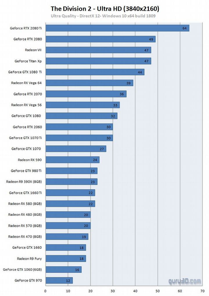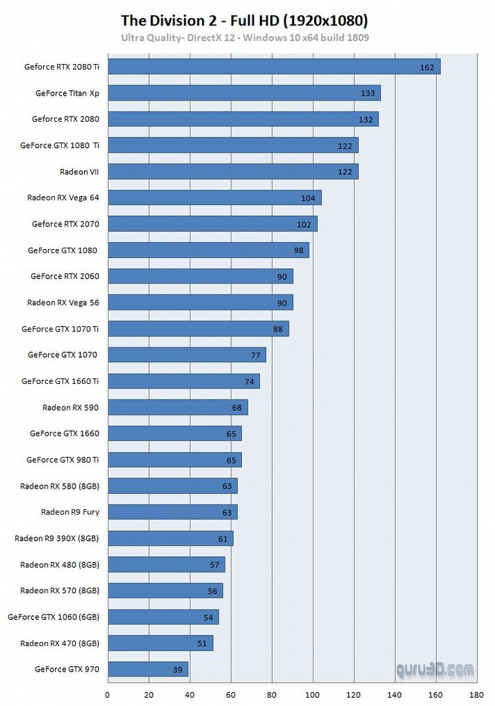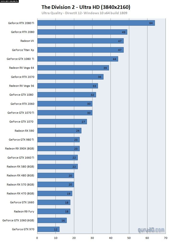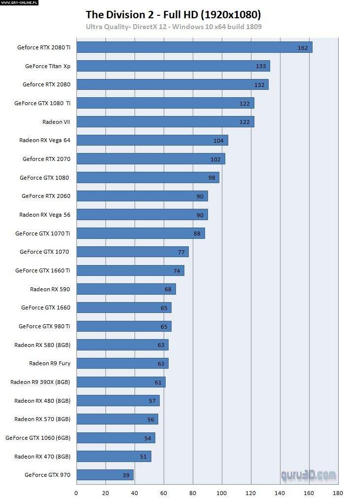 Redaktorzy serwisu Guru3D przeprowadzili testy wydajności wydanej w tym tygodniu gry The Division 2 na 24 najpopularniejszych układach graficznych od AMD i Nvidii. Tytuł Ubisoftu najlepsze wyniki notuje na karcie GeForce RTX 2080 Ti.